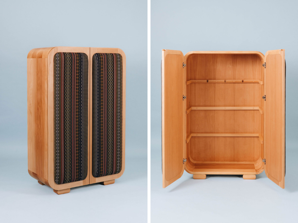 r.hutch: an oval-shaped double-door cabinet that stands at an abbreviated height of 50-inches, featuring interchangeable fabric-paneled doors. Available in beech and seven designer fabrics.