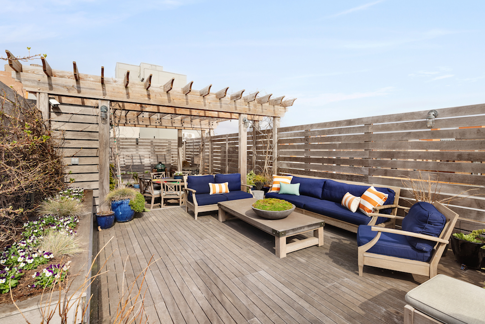 Beautiful glass doors open onto an outdoor deck with built-in grill and city views for intimate gatherings, while the larger roof deck, also with a built-in grill, has room for guests beneath wood-pergola shading. A vintage bar sourced from an old hotel and brought up to date with new plumbing and fixtures provides a distinctive location for entertaining.