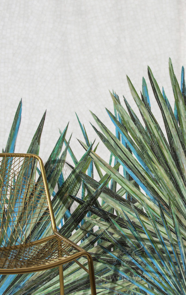 The artwork for the collection explores scenes from nature, such as lush greens that create a vertical garden, interlacing patterns of snakeskin, light reflecting on a pool of water, gentle gradations of a misty morning, and a screen of palm fronds. The large, repeating pattern of textile designer Kevin O’Brien’s signature design, “Weeping Willow“, becomes a textured, ombre expanse of branches and leaves in its mosaic form.