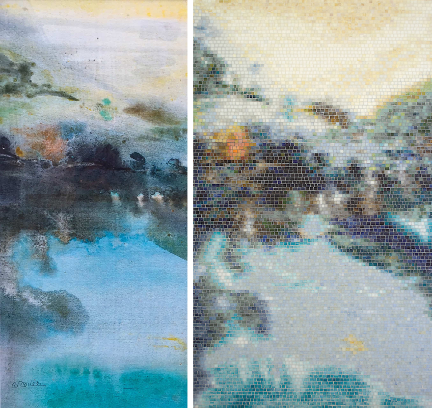 (Left): “Black Pool” by Gail Miller; acrylic on canvas. (Right): “Black Pool” from New Ravenna; Sea Glass Mosaic; 72″h x 42″w.