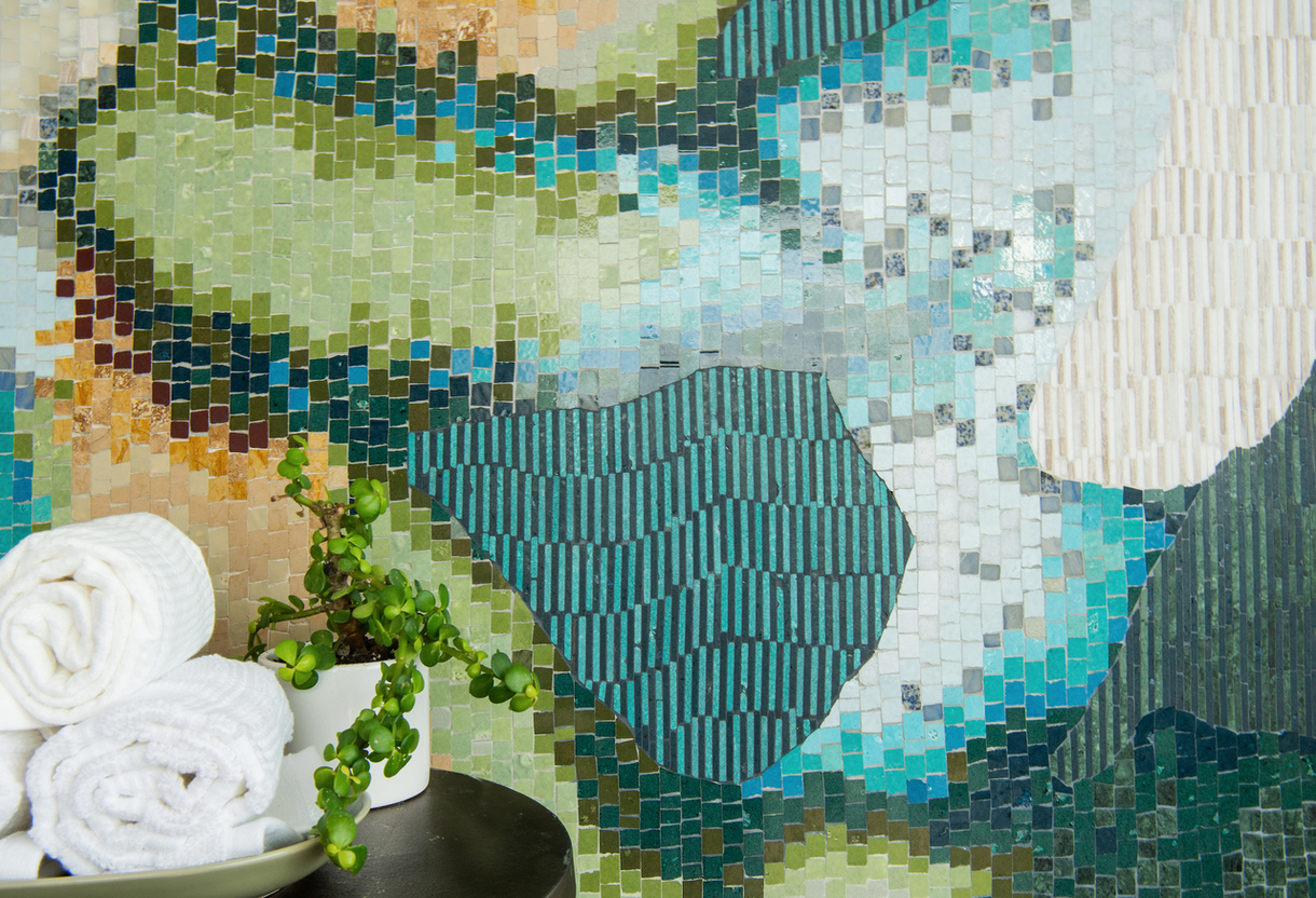 In August of 2022 the expert mosaic manufacturers at New Ravenna invited you to become a part of their catalog – now their ready to reveal who made the cut. The Pinnacle collection features four designs chosen from submissions to New Ravenna’s first Mosaic Design Competition in celebration of their 30th Anniversary. Two designs from each category, Fine Art and Pattern, prevailed – You Shape the World Around You by Heather Green and Moon Jellies by Jacquelyn Bizzotto, in the Fine Art category, and Canna by Jessica Battista and Norris by Zachary Bowen in the Pattern category.