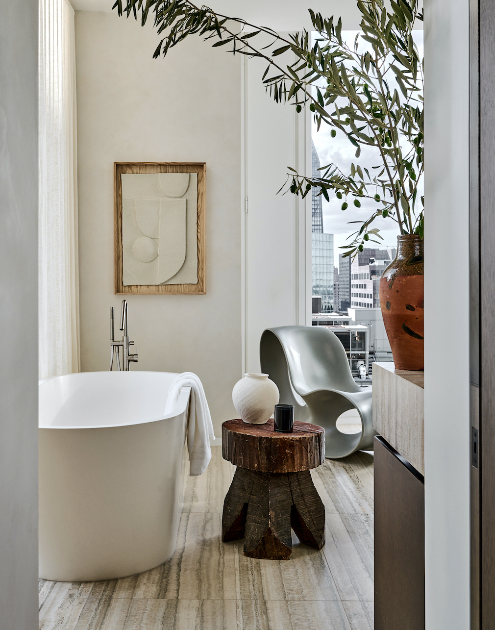 Trade Secret: Using natural materials, such as the custom Color Atelier limewash walls and natural stone furniture, adds warmth and texture to the spaces.