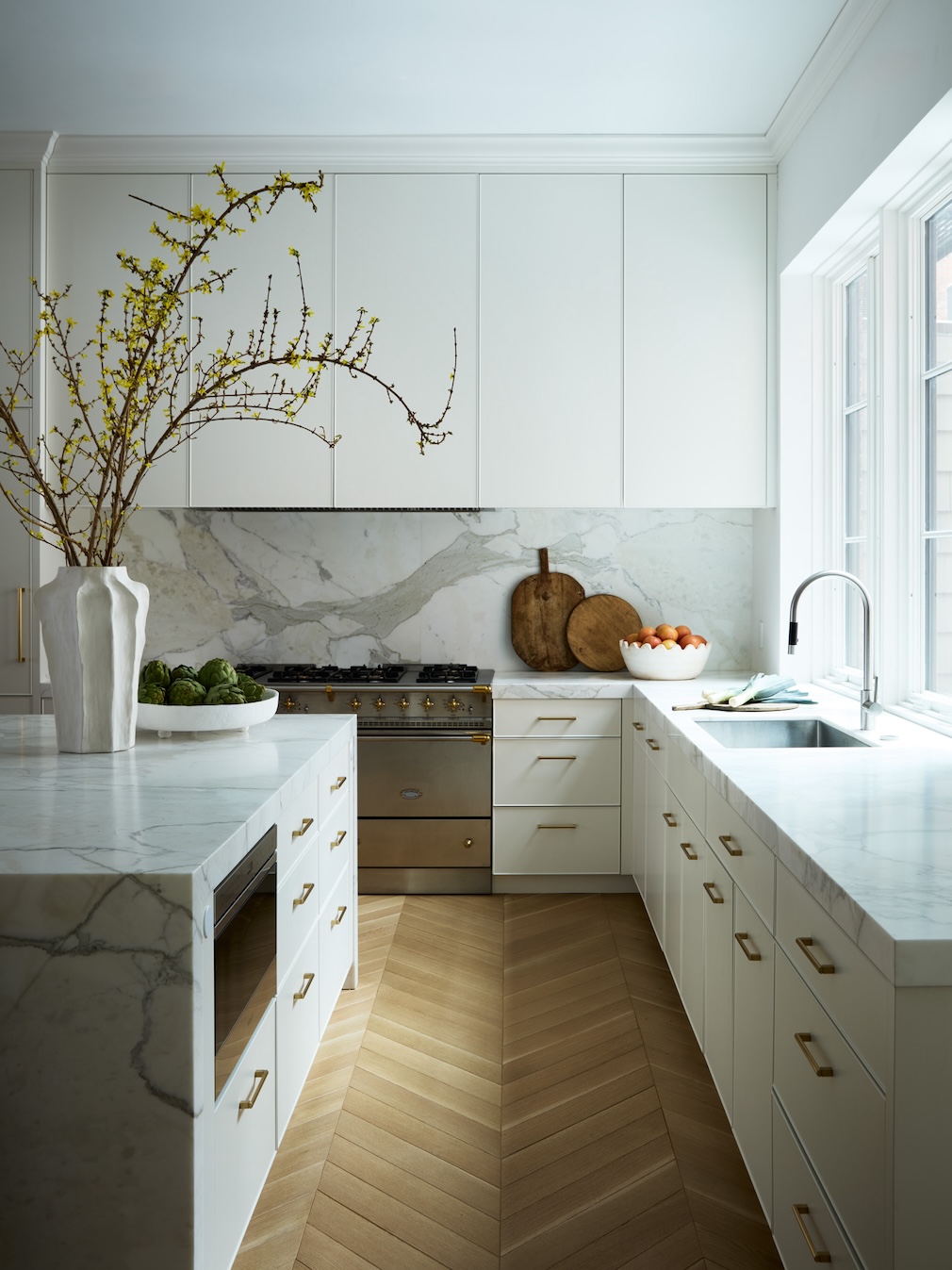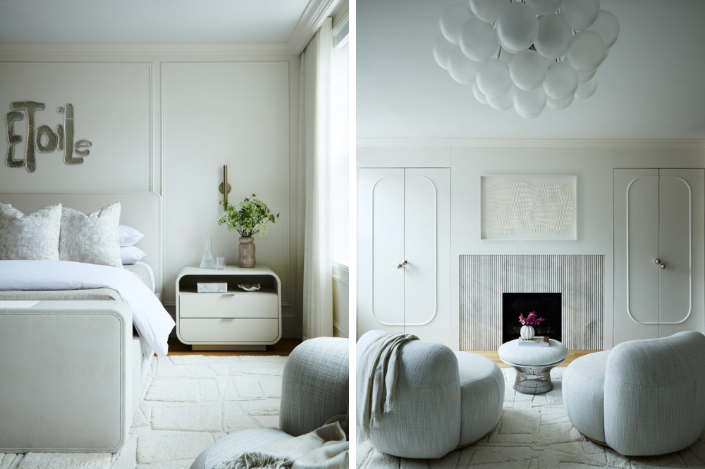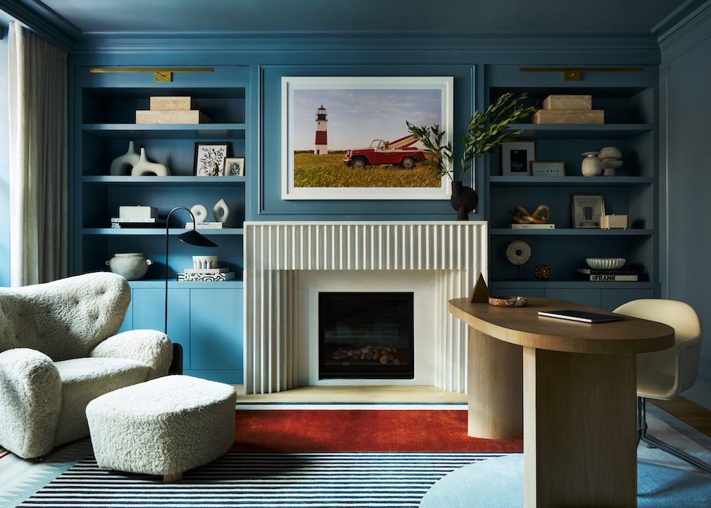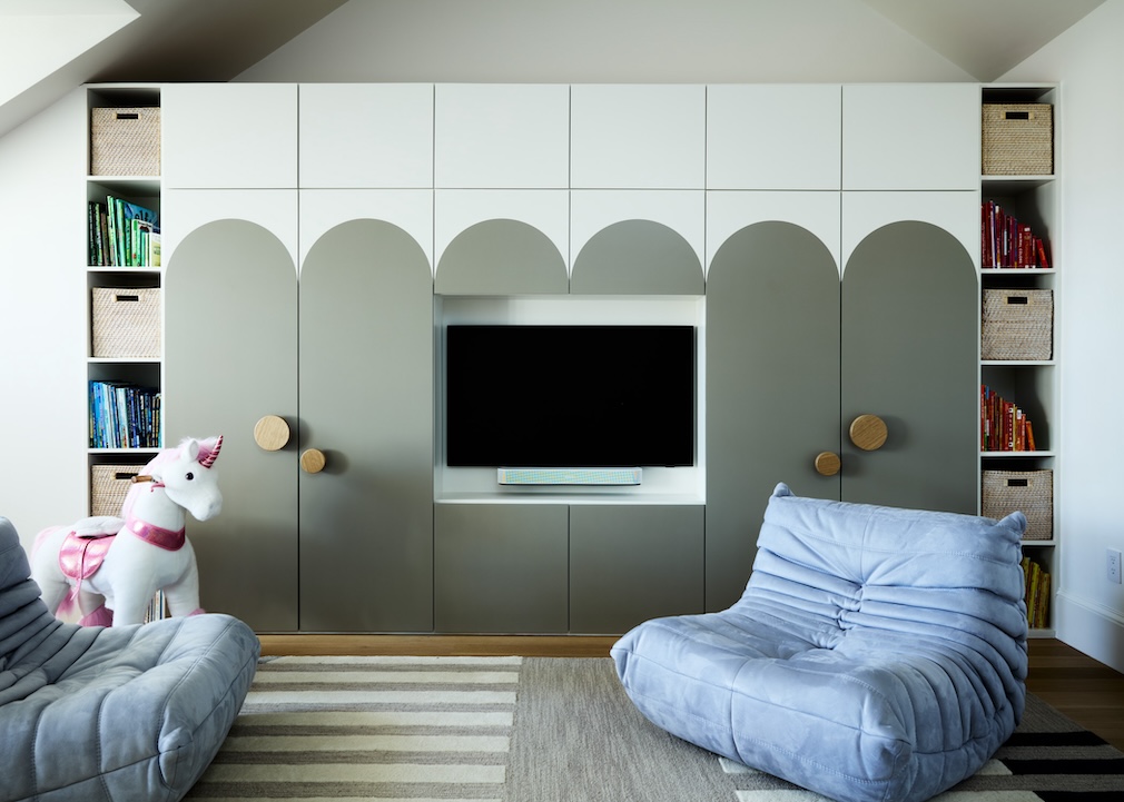 Even the children’s playroom is designed with poetic pragmatism, featuring built-in cabinetry that doubles as art, and custom sectionals that shift from story time to soirée. And then there are the quieter gestures, those subtle echoes of the past that are effortlessly rendered fresh again. Hirsch points to the applied wall moldings that disguise storage in the living room, and to the custom, oversize knobs in the primary suite that recall vintage purse clasps. “Each hardware piece had to be both elegant and understated,” she shares. “It’s these small details that knit the home’s narrative together.”