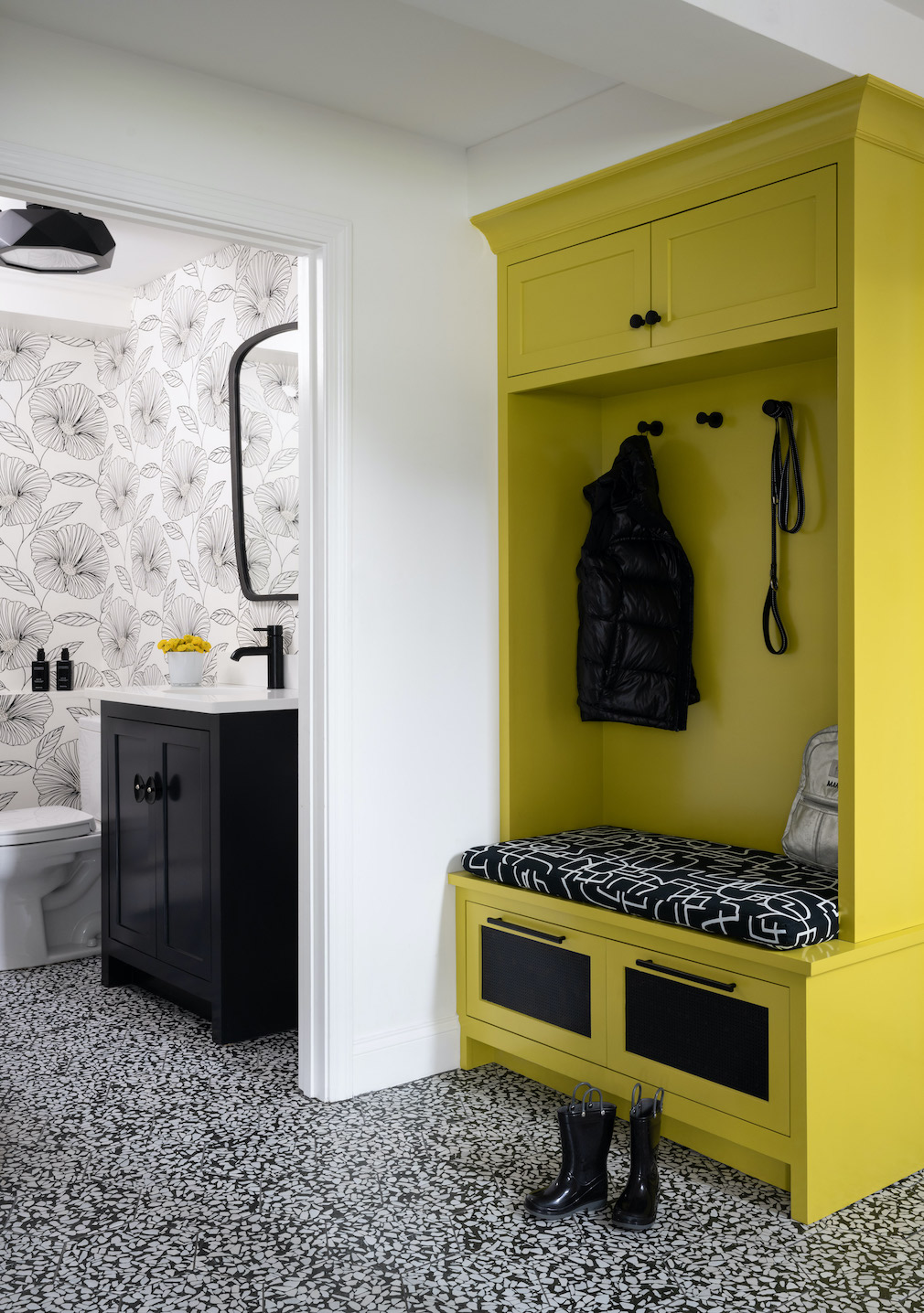 A punch of color comes in the way of a custom designed and made built-in coat and storage unit painted in Benjamin Moore’s lively Citrus Burst 364. Made in Spain, the random pattern of the Riazza Hex by Soho Studio flooring offers the look of poured terrazzo. The stylized floral wallpaper in the bath is Mythic Black Floral by Brewster.