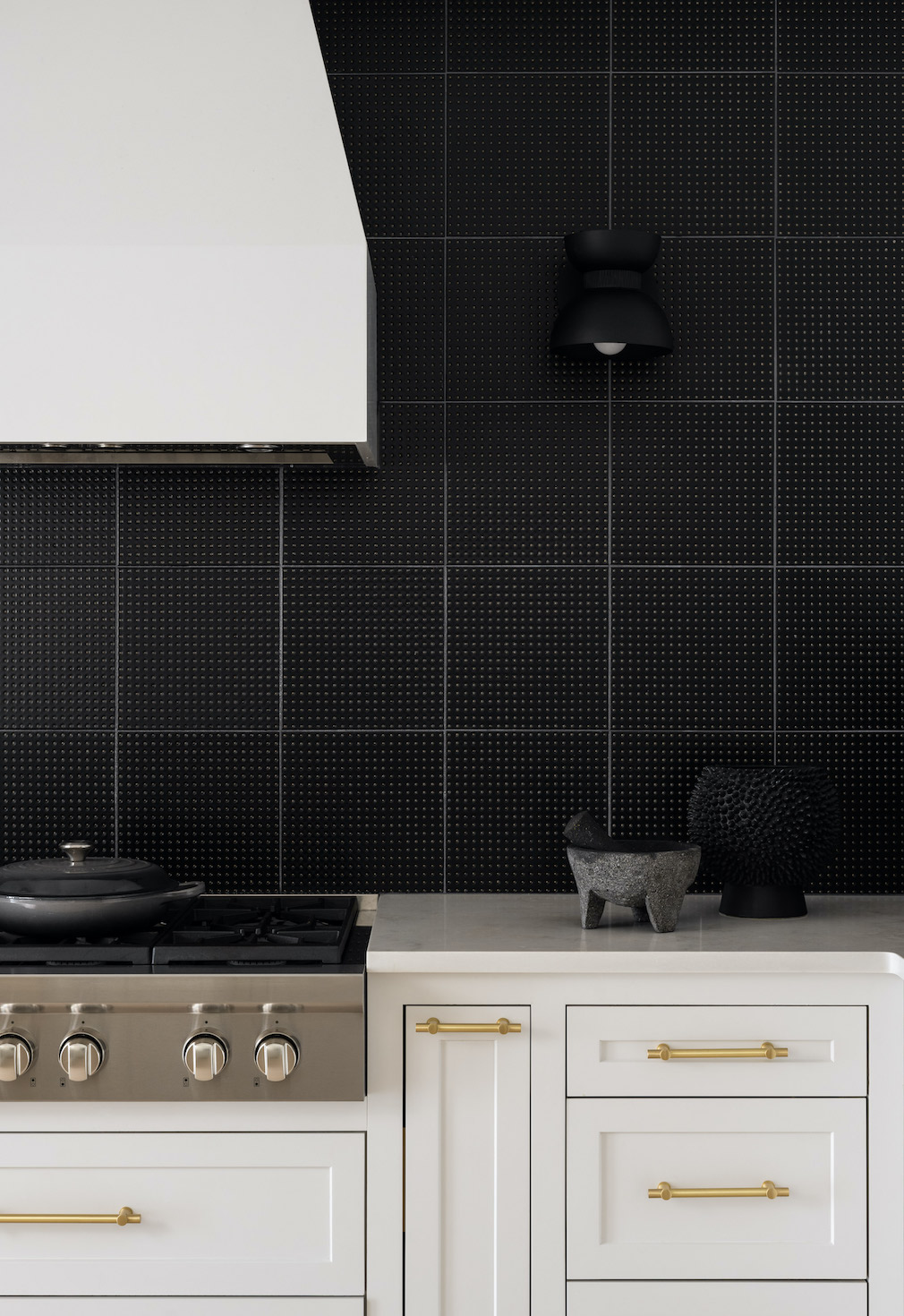 In the kitchen, classic white cabinets gain some glamour with soft gold hardware that is echoed in the black tile’s gold studs.