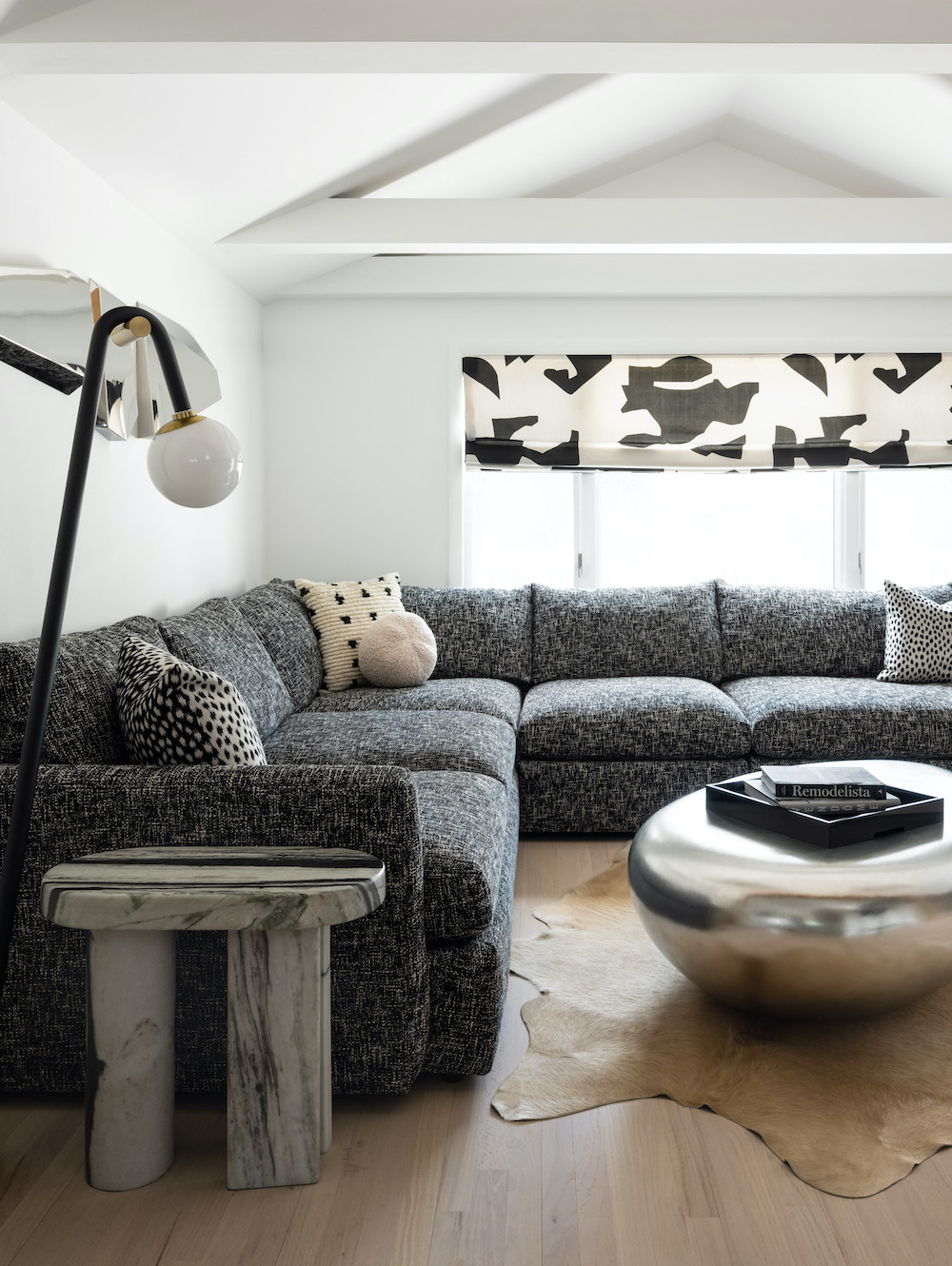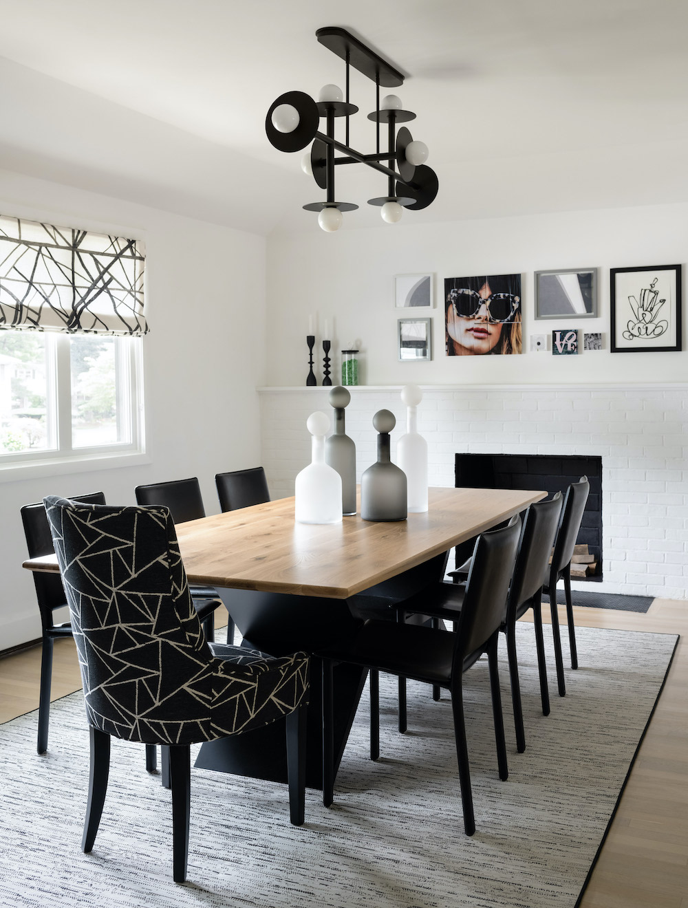 “This was about re-inventing a well-loved, dated home for its new owners, a young family whose style is modern and playful,” explains Seed, who is principal of Nina Seed Interiors. “We wanted to run with a predominantly black and white scheme that would also be warm enough to make this an inviting and approachable home for years to come.” The designer notes livelier elements of color, pattern, and texture were woven into the house’s overarching palette to showcase the family’s fun and bold style. The goal was to make “each space unique and specific to them, while making sure nothing was too precious and would be able to withstand young children and animals.”