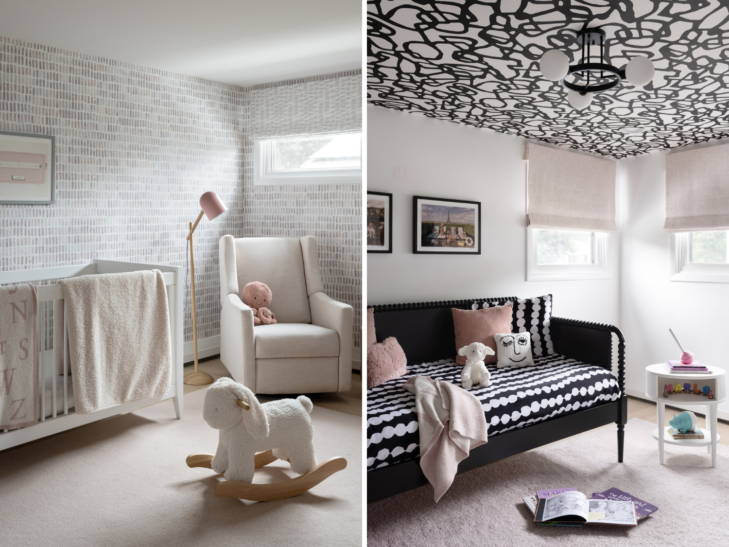 Spaces for young girls to grow into, the kids’ rooms continue with the black and white scheme, with more feminine and playful touches peppered throughout. The patterned paper on the ceiling (right) is Pompeii by Savannah Hayes.