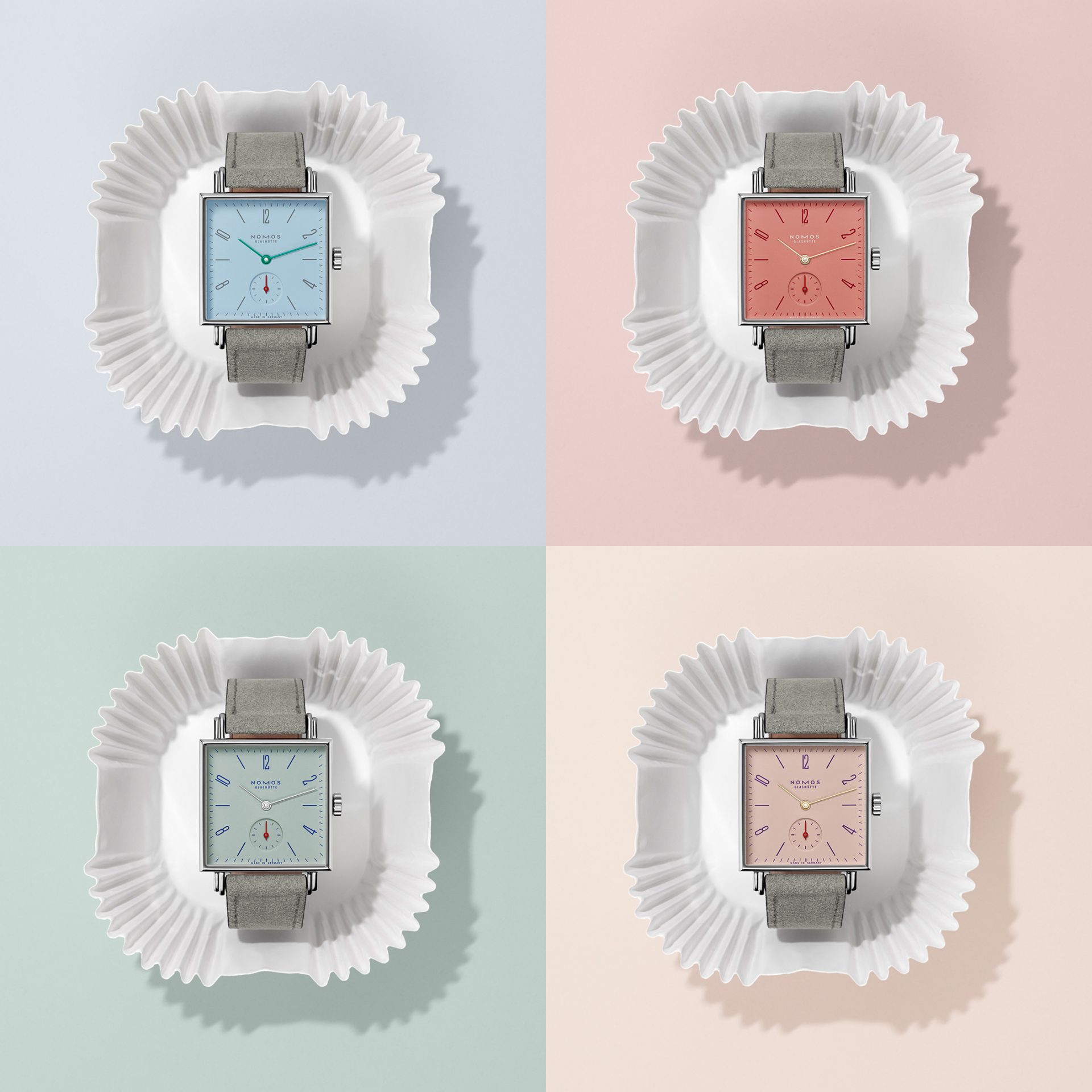 NOMOS Petit Four wrist watch series in Matcha, Azure, Pearl and Grenadine | Traditionally crafted by hand in Glashütte. Every individual movement is adjusted in six positions and features Glashütte ribbing, tempered blue screws and NOMOS perlage. In two of the four watches, the hand-wound caliber can be viewed at work through a sapphire crystal glass back. The two others, Tetra Matcha and Tetra Azure, offer space for a personalized engraving on their stainless steel backs.