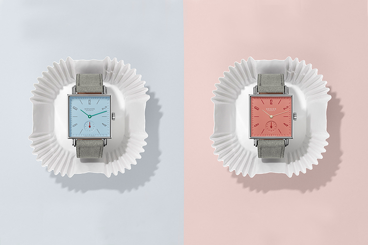 NOMOS Petit Four wrist watch series in Matcha, Azure, Pearl and Grenadine | Traditionally crafted by hand in Glashütte. Every individual movement is adjusted in six positions and features Glashütte ribbing, tempered blue screws and NOMOS perlage. In two of the four watches, the hand-wound caliber can be viewed at work through a sapphire crystal glass back. The two others, Tetra Matcha and Tetra Azure, offer space for a personalized engraving on their stainless steel backs.