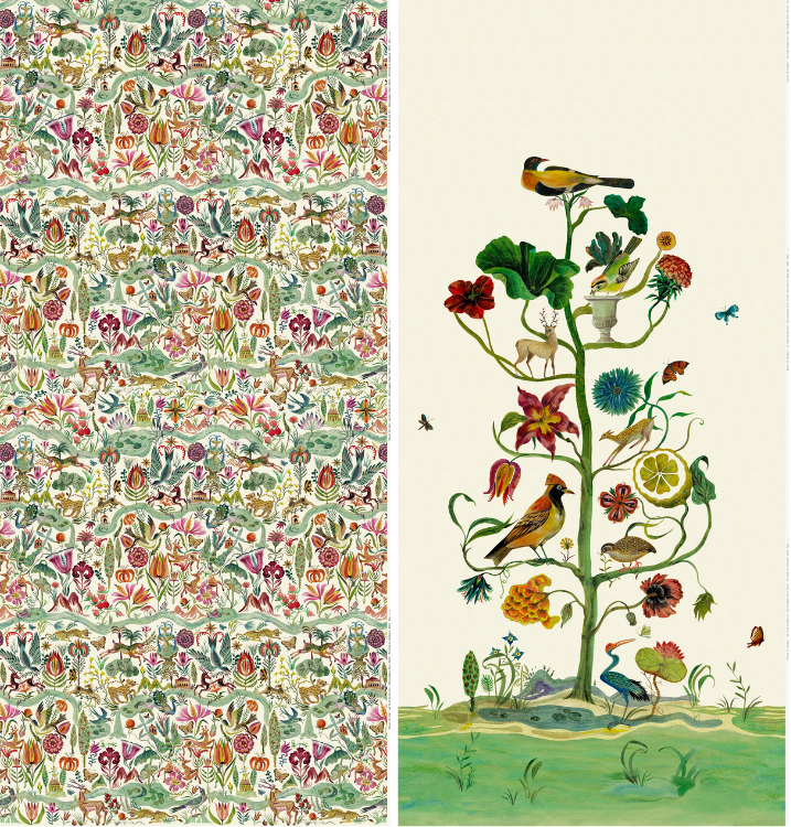 That’s true of Trees of Wonder (right), wallpaper panels that feel Indian-inspired, but nevertheless retain their own personality. Dancing Vines recalls colorful African cloth but also feels just as identified with Secessionist aesthetics. Christopher Farr Cloth’s creative director, Michal Silver, says “There is a magical realism to his work with its explosion of color, abundance of detail, texture and storytelling.”