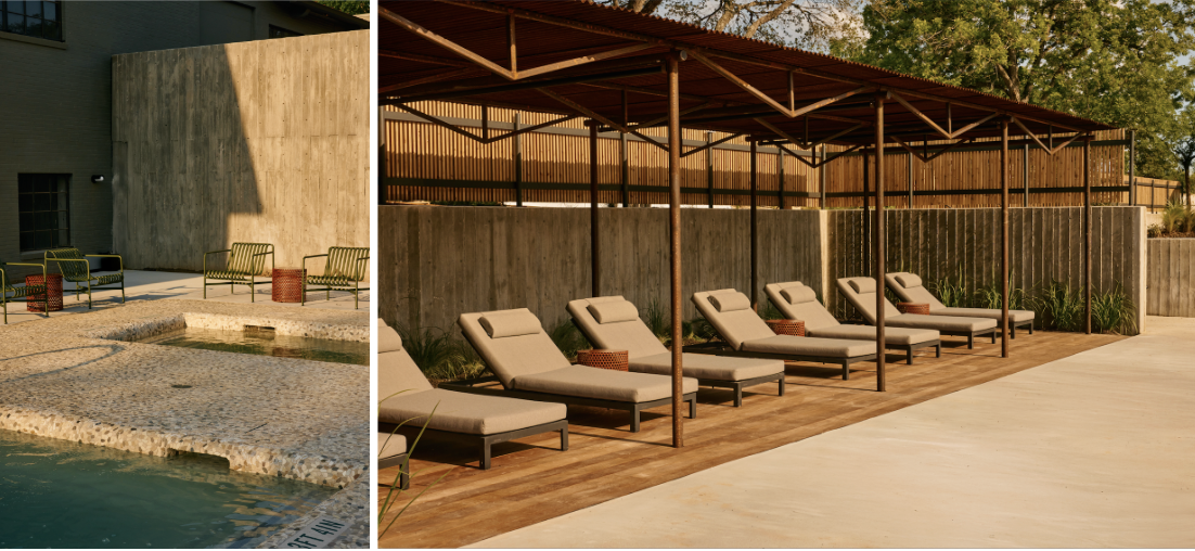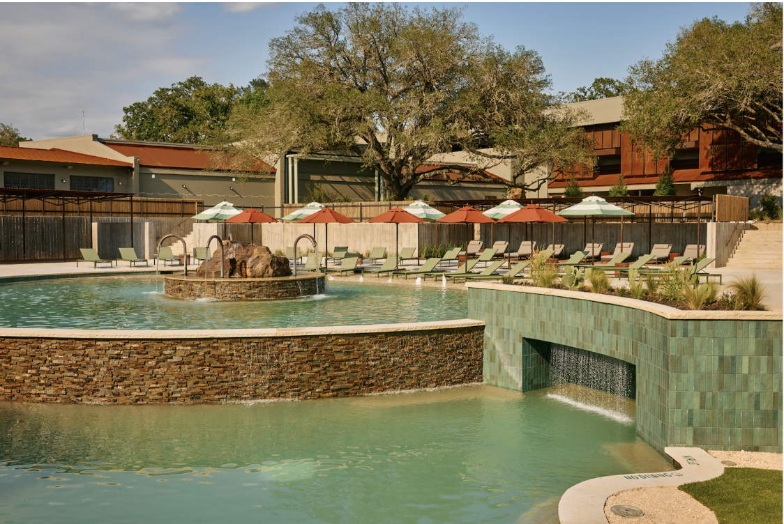 Equipped with one stellar design team led by Vanessa Francis of Francis – Design Studio in collaboration with ownership, Maggie Goen of Goen Buckley Design, Jack Sanders of Design Build Adventure, and Ebbn Milks of Aqua Builders, the immersive retreat is outfitted with five highly-coveted spring-fed mineral pools, including a hot plunge and a cold plunge for those addicted to the invigorating icy challenge. In true Texas fashion, each pool — which ranges in temperature from 40 to 104 degrees — is named after an iconic native plant or tree. The Palmetto Pool — the largest of the five revitalizing bodies of water — is wrapped in striking glazed porcelain tiles from Emser, aptly named Passion. Their vivid hue mirrors the surrounding landscape, imbuing the water with a shimmering emerald glow that heightens its allure. Limestone lueders define the pool coping around the Palmetto and the smaller, adjacent Sage pool — an equally enticing watery oasis.