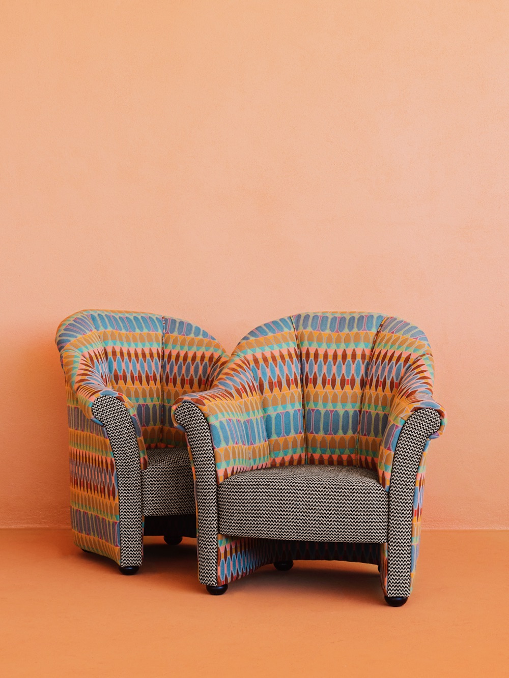 S. Harris created the Chroma collection to bring forward a group of performance fabrics and wallcoverings inspired by the intersection of color and the cosmos, where contemporary design is rooted in ancient wisdom. Pictured: Picatrix in Saturn, and on the seat, Yod in Shadow from the Elements Binder outdoor collection.