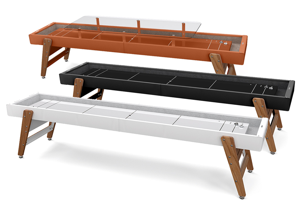 Available with a glass top, the Track Dining shuffleboard is both a game table and a tall bar table. In fact, the game, with some snacks and drinks to share, has a different flavor. Designed by Rafael Rodríguez.