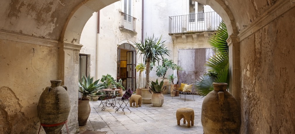 In 2022, after years of working in fashion and the recent opening of their modern antiques gallery and interior design business, 7887 Gallery Studio, in Reggio Emilia, Raffaele Corsaro and Gabriella Cataldi treated themselves to a Sicilian escape in search of inspiration. Vacationing on Ortigia – the island that forms the historical center of Syracuse in Sicily – they wandered from the tourist-filled streets near the waterfront to explore quieter byways, where they came across a crumbling, 17th-century palazzo. When they returned to house hunt a few months later, they visited 25 properties; little did they know the last one they’d be shown would be the time-worn pile they had encountered earlier.