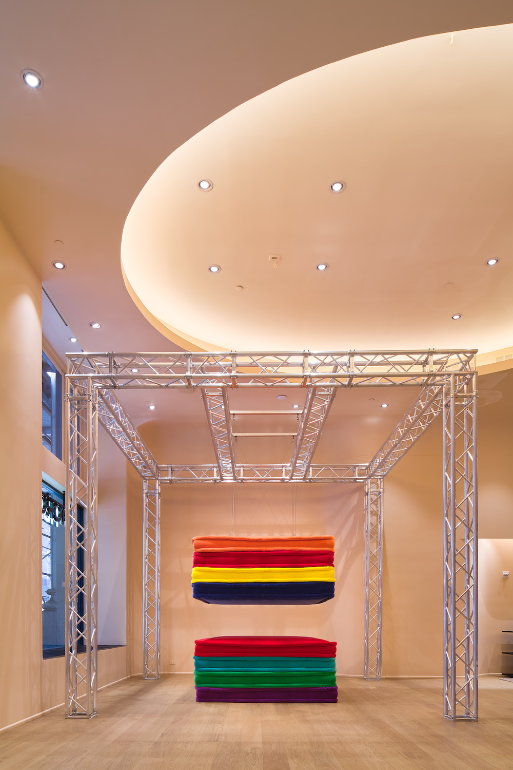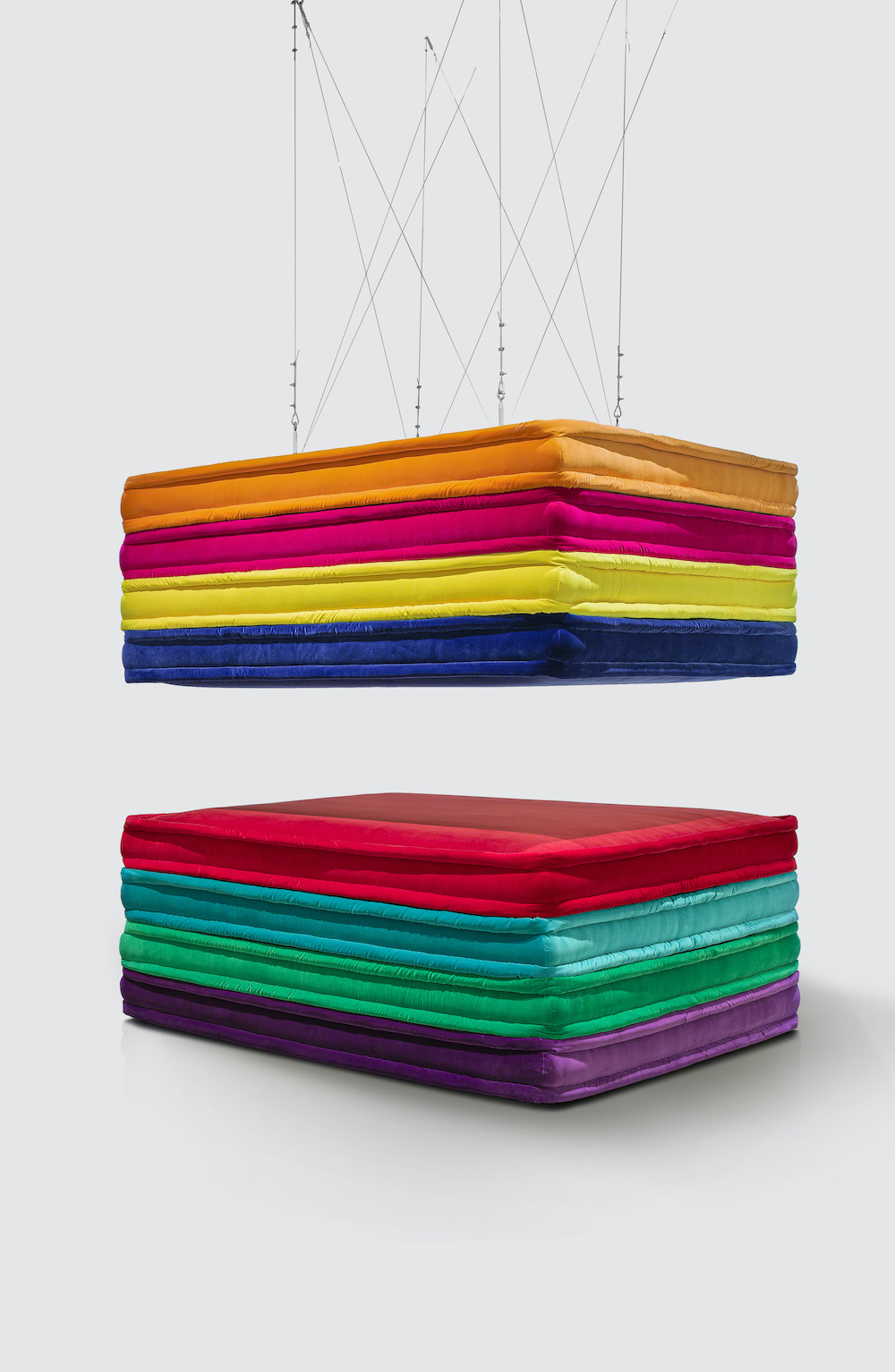 Presented in collaboration with Perrotin Art Gallery and utilizing Moroso’s captivating materials, MILANO is playful and magnetic. A multi-colored stack of abundant velvet mattresses, the upper section is suspended in space. The accessible space between the two halves is broad and comfortable, while simultaneously new and intriguing, creating an empty passageway that viewers are free to fill or contemplate.