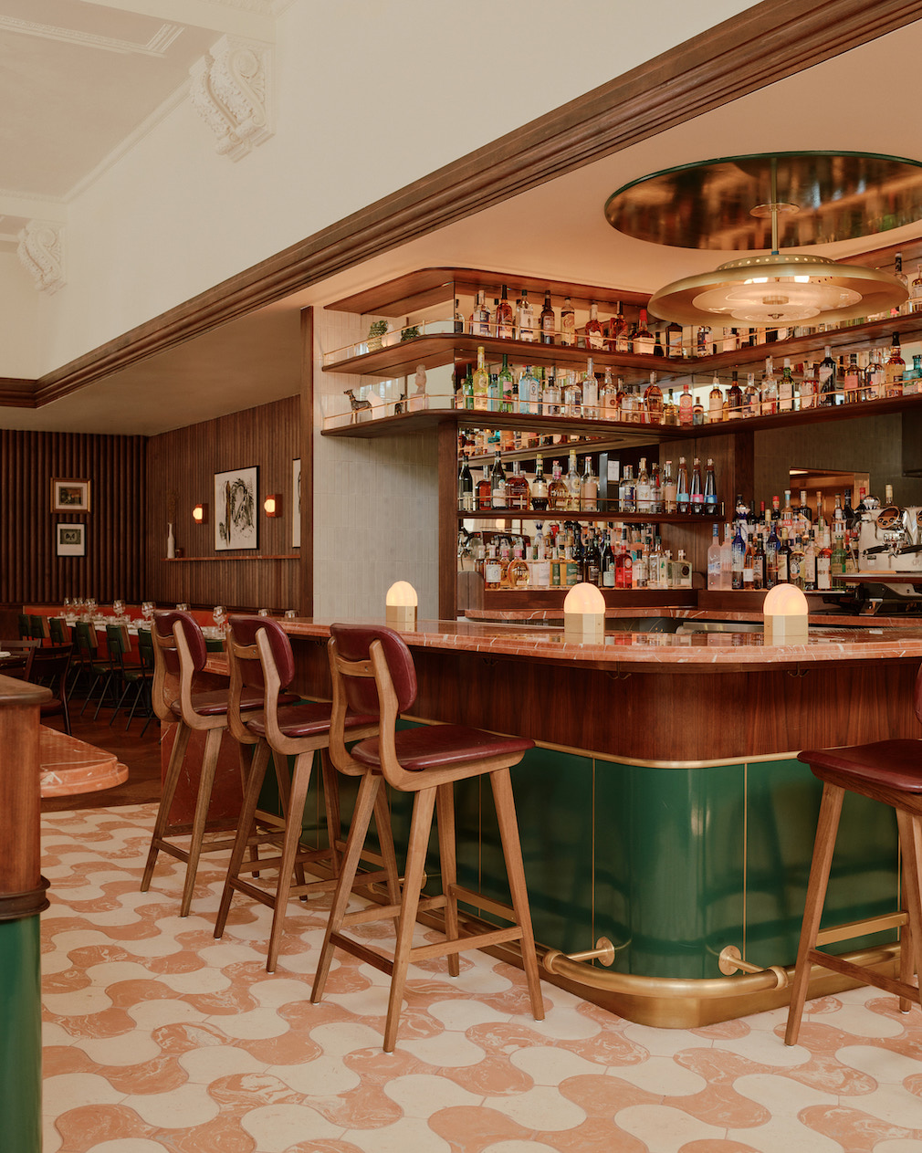 Almost all the custom lighting, from the sculptural milk glass pendants, inspired by old-world chandeliers, to the wood-encased sconces and brass fixtures, pays homage to a past era yet feels entirely of this time. Original building details, such as high ceilings and elaborate crown molding, were preserved to maintain the restaurant’s sense of history. Every seating area is perfectly framed for the guests and the spirited action abounding, especially with a custom bright orange banquette that wraps around the main dining area.