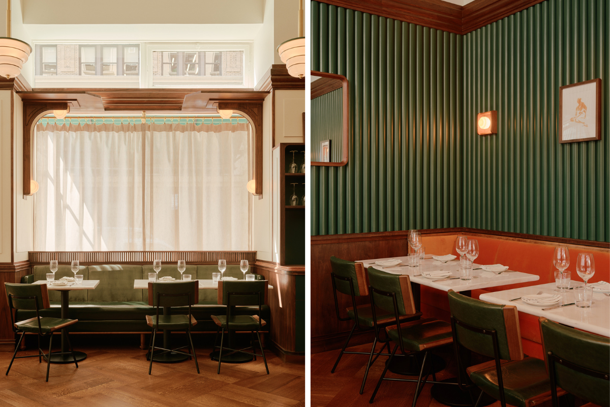 Fluted walnut wood panels echo the hundreds of trees in nearby Madison Square Park, as do the forest-colored walls and custom parquet flooring. By the window seats, natural light filters in through sheer linen curtains. Rosa alicante marble, an Italian soft red stone with white and gray striations, adorns Lupetto’s surfaces.