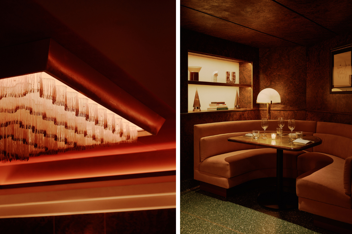 Here, Parts and Labor Design’s custom lighting program takes the stage. A velvet-framed chandelier, featuring a squared grove of hand-dyed tassels, plays the starring protagonist. Triangular metallic sconces and delicate lamps gently light the wall like jewels. The walls and low ceiling, clad in dark burled wood, create the feeling of an intimate private party. Rich materials like luxe pink velvet encourage guests to get close. It’s a quintessential New York destination that absorbs your sense of time without a mere hint.