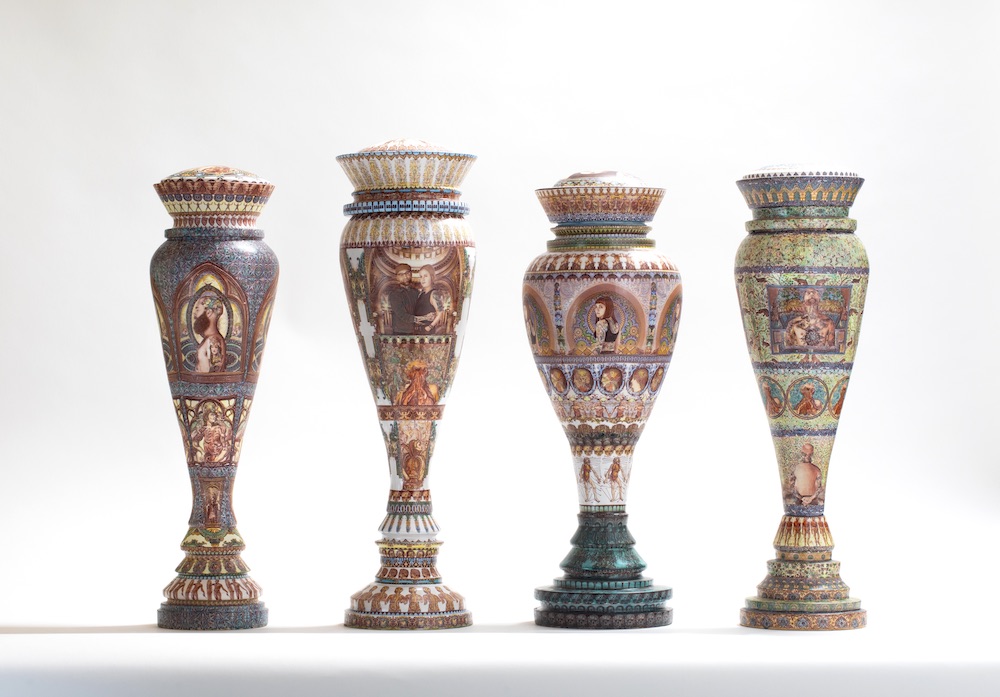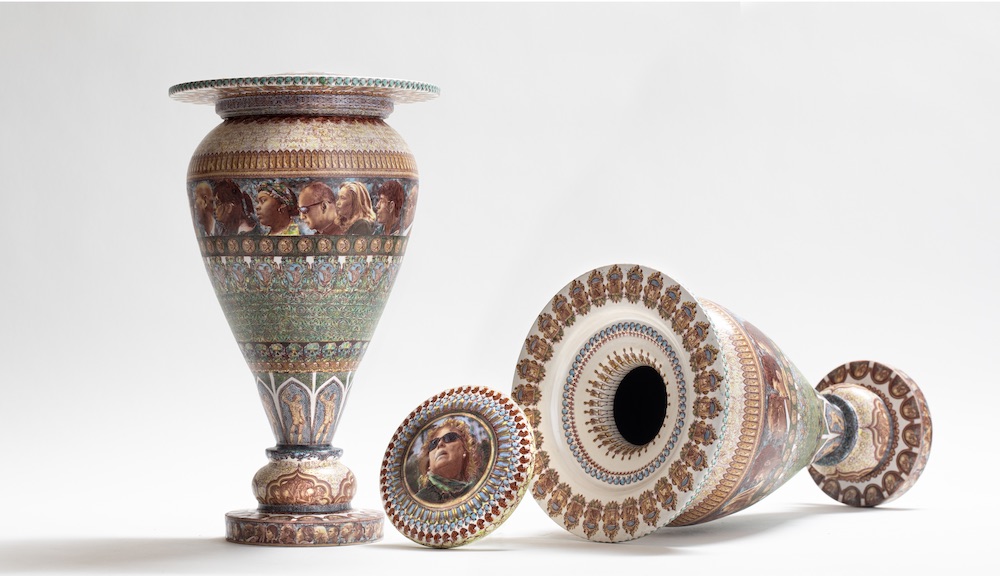 Building on a decades-long career as a professional photographer, Peter Olson set out to expand his catalogue raisonné with a venture into the craft of ceramics — taking local studio classes to learn the basics and then launching a studio of his own. In doing so, the artist did not by any means leave his camera behind, but rather created an entirely new canvas that would highlight a different angle of his practiced perspective. Olson’s work in ceramics has been influenced by everything from street photographers like Robert Frank and Danny Lyon to 18th-century Sevres porcelain, which similarly incorporated imagery of people of the day into decorative objects. “In a sense,” Olson says of the time-honored porcelain line, “that’s what I’m working to do with these today, but with more topical, more in-your-face people.”