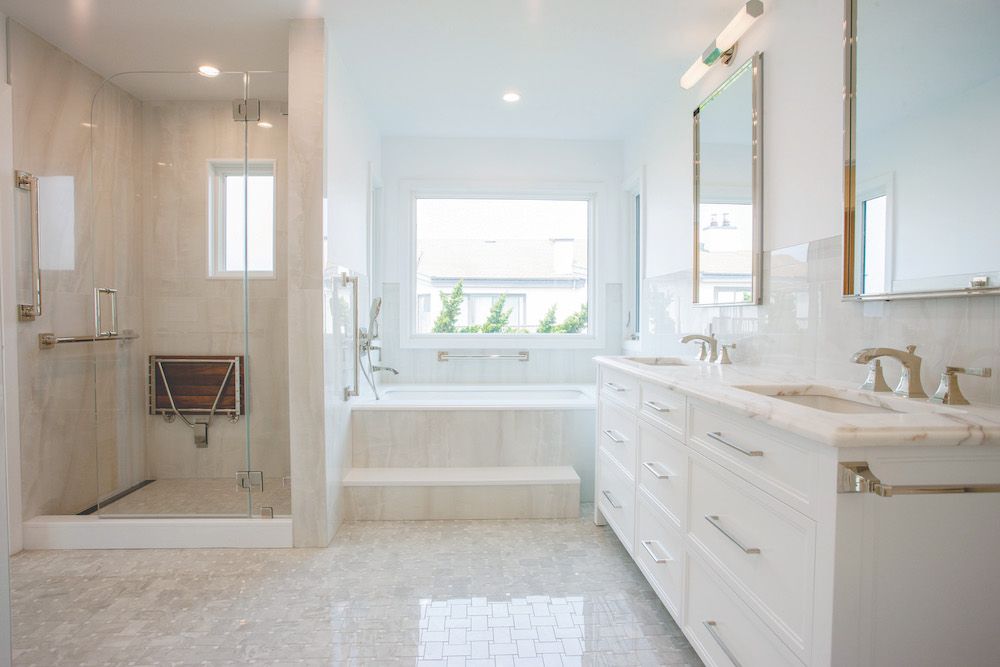 Using ADA accessories, including a folding teak shower seat and accessories, this chic primary bath was tweaked to accommodate its residents.
