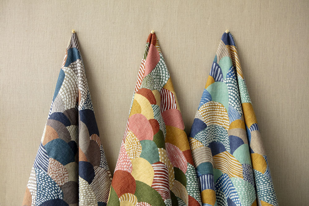 Meadowland is a fantastical retelling of a field of rolling hills. The complex design of colorful, whimsical shapes filled with stitched dots, stripes, and dashes, uses a 14-color screen print and is all done by hand, including the embellishment of hand-guided embroidery.