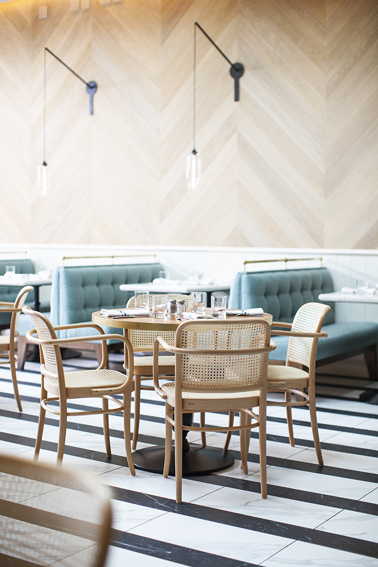 “The connotation of organic, bistro, farm-to-table food, and coastal culture—of the Pacific Palisades and also East Coast places I went growing up, like the Hamptons and Maine—gave direction for the design approach,” notes Goineau. Antique brass finishes, natural stone, walnut tabletops, chevron paneled walls, wooden ceiling fans, and giant botanical greens are the details that harmoniously create the overall look. Pastel hues and shiny brass add a touch of 1940s sophistication.