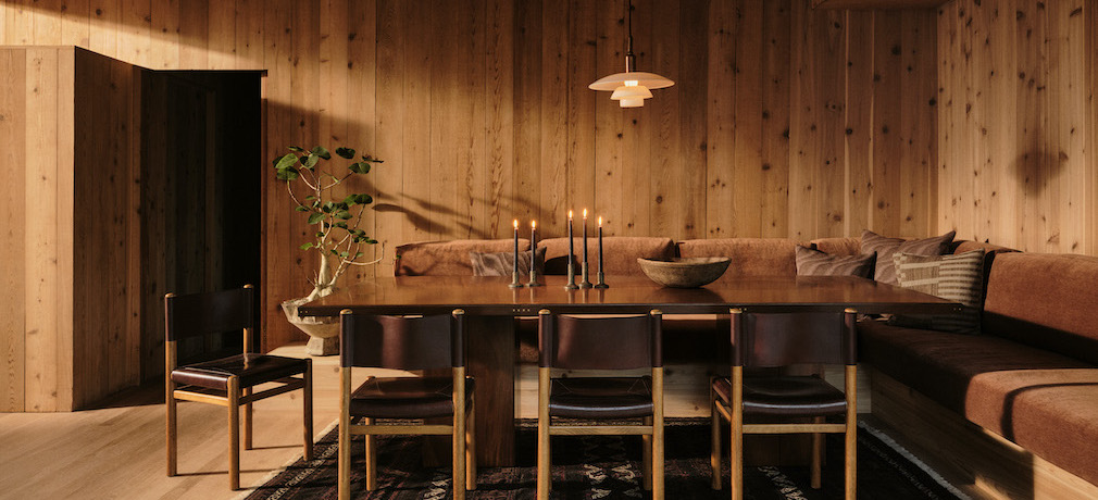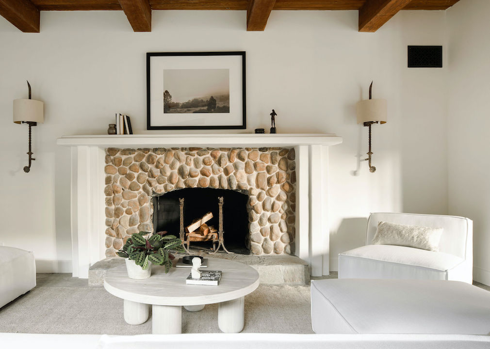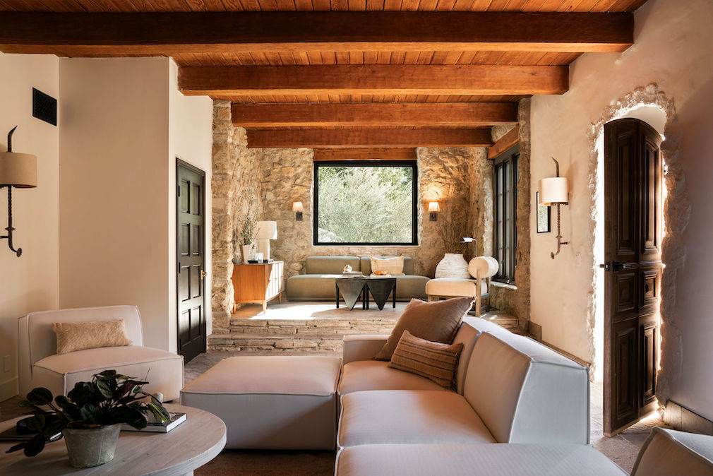 Speaking of materiality, nothing was off limits. This inclusivity led to the integration of natural stones, brass tones and cedar woods, which proved pivotal in creating the home’s warm, inviting atmosphere. “Texture and tone are so important in our designs,” adds Hahn. “We use materials like oak and stained wood to add depth and character to each space,” a practice that is on display through the added beams and wood treatment applied to the ceilings, which further emphasizes the importance of honoring materiality in order to achieve the right balance of warmth and modernity.