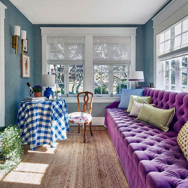 Fiber-Seal can help every hue stay true, from cheerful blue-and-white check to impactful purple, such as in this sunroom by Toledo Geller.