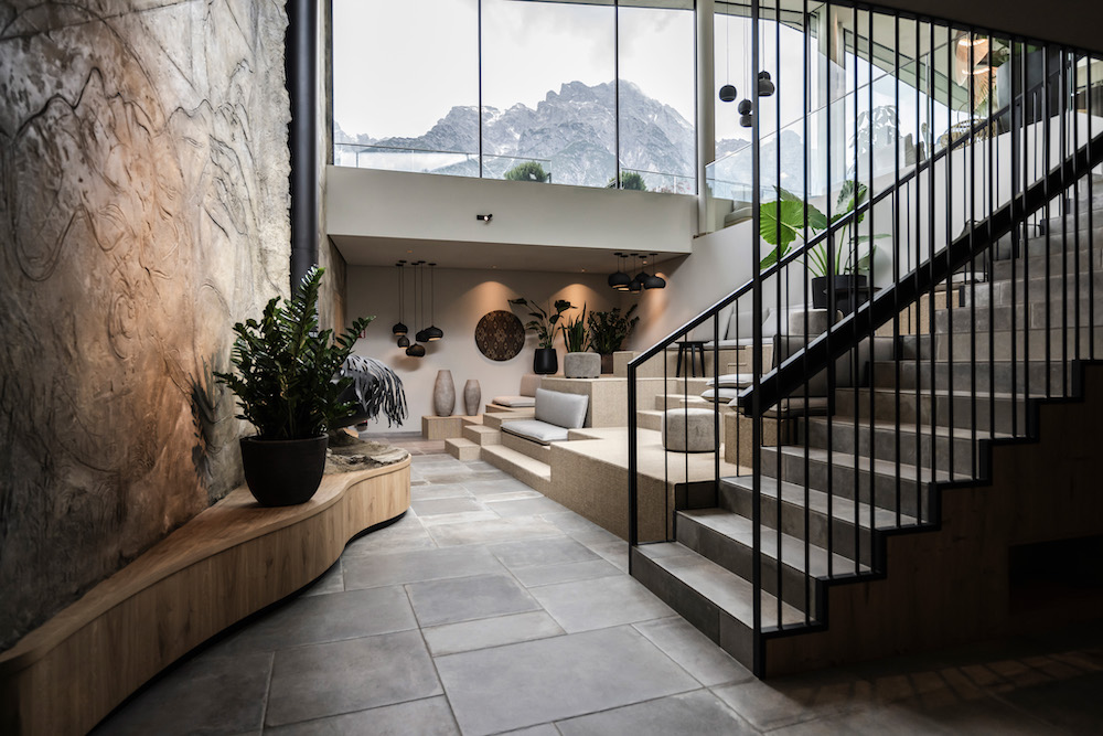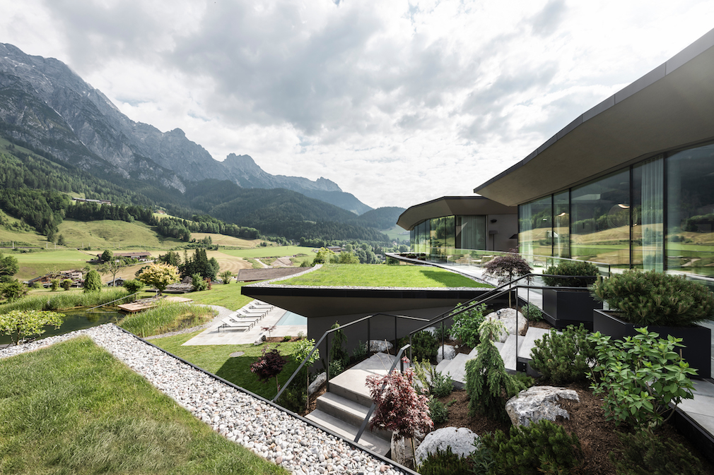 A breathtaking mountain backdrop, lush green meadows, a small lake and plenty of fresh air make the Puradies nature resort in Leogang in Salzburg a haven of vitality. Completed this summer, architecture firm NOA has expanded the facilities with a new spa themed around the elements of fire, water, earth and air.