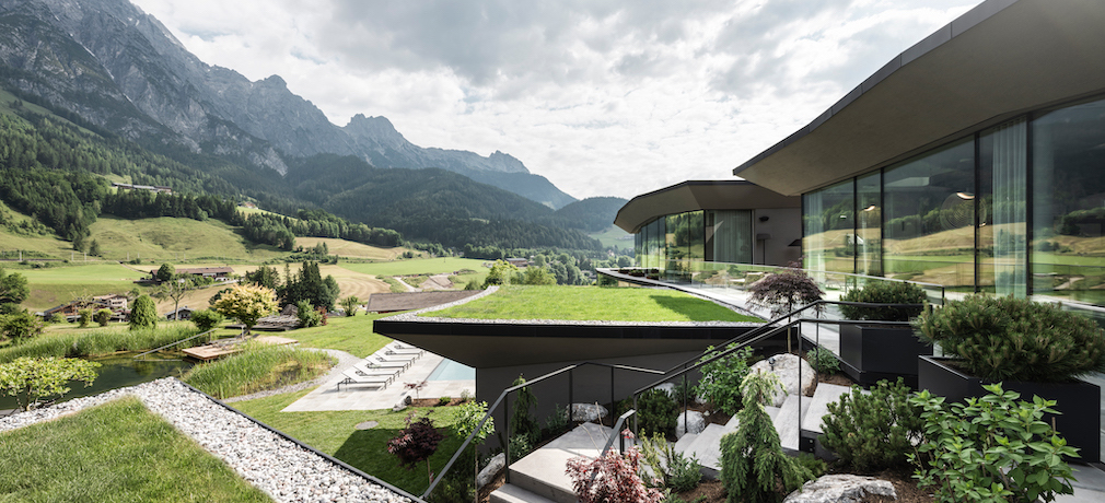 A breathtaking mountain backdrop, lush green meadows, a small lake and plenty of fresh air make the Puradies nature resort in Leogang in Salzburg a haven of vitality. Completed this summer, architecture firm NOA has expanded the facilities with a new spa themed around the elements of fire, water, earth and air.