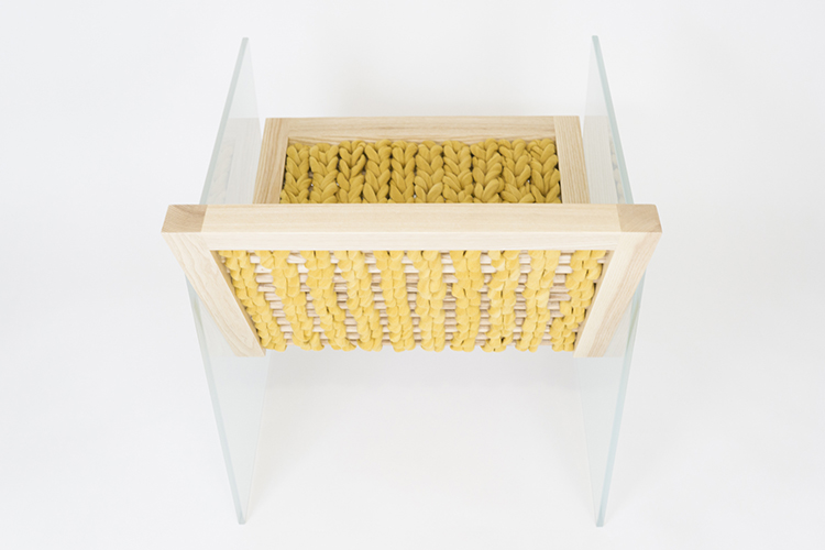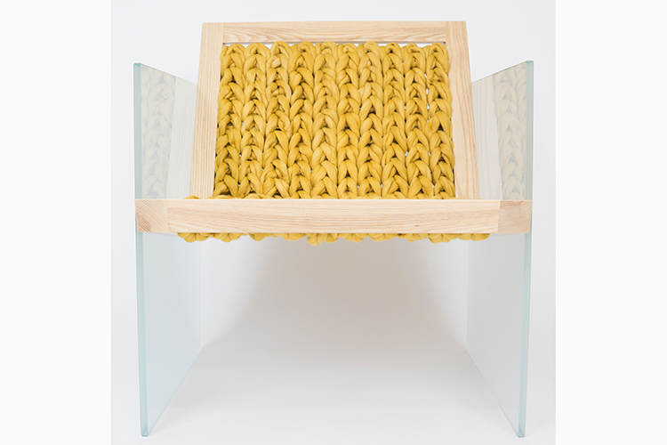 Purl Lounge Chair | Acid etching gives the glass legs of the Purl Lounge Chair a satin finish that’s smooth to the touch. These satin legs suspend the ash wood frame seemingly in mid-air through brushed brass connections. The frame itself is actually a loom onto which the cushion is woven creating a simple, daring, and surprisingly comfortable lounge chair.