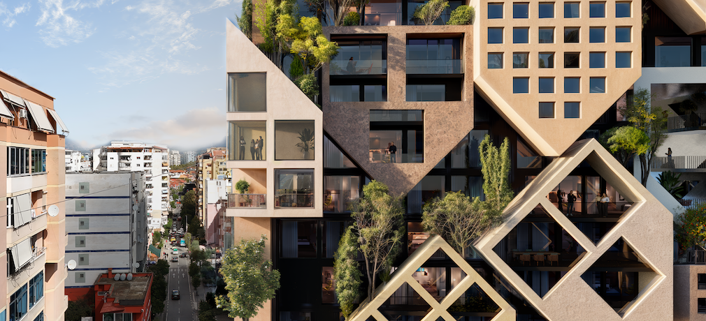 This vertical village is more than just a formal feature: each module represents extra space for apartments and commercial areas. It’s a hybrid space, both indoor and outdoor, that can host endless functions—hanging gardens, loggias, open-air cinemas, pools, saunas, barbecue areas, and more. The building’s four facades hold equal architectural value, allowing the tower to interact harmoniously with the surrounding urban context. A triangular entrance marks the entry to the shopping center on Rruga Medar Shtylla.