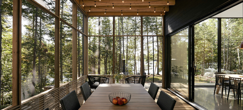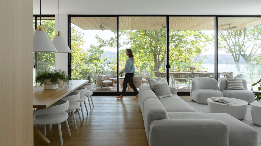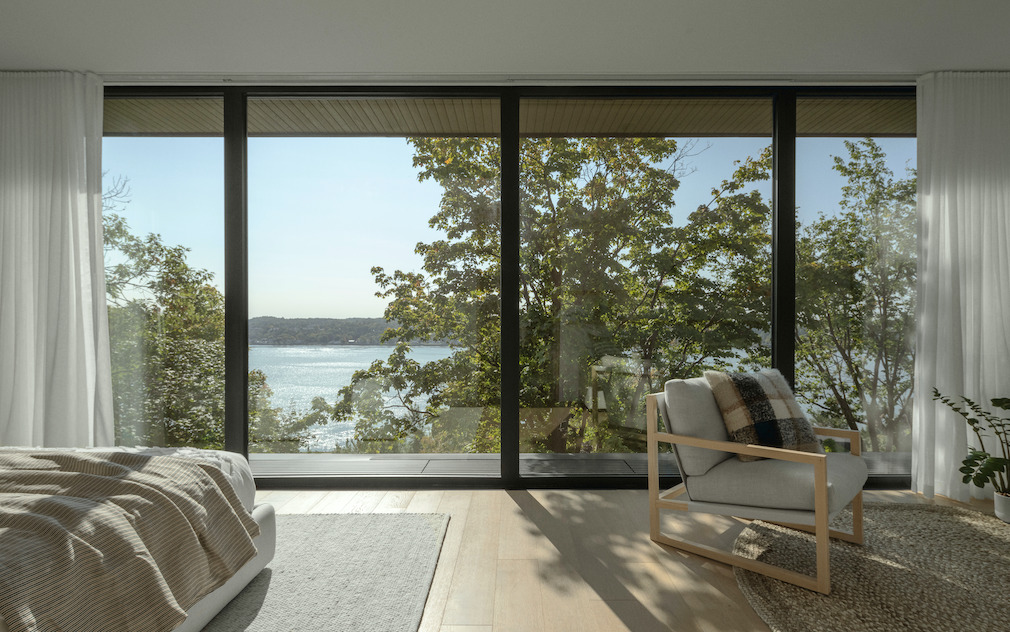 The residence’s open, clean, and abundantly windowed living spaces offer breathtaking views of the mature trees of the cliff and the St. Lawrence River. The simplicity of the interior design allows the spectacular views to be constantly highlighted, creating bright and soothing atmospheres.