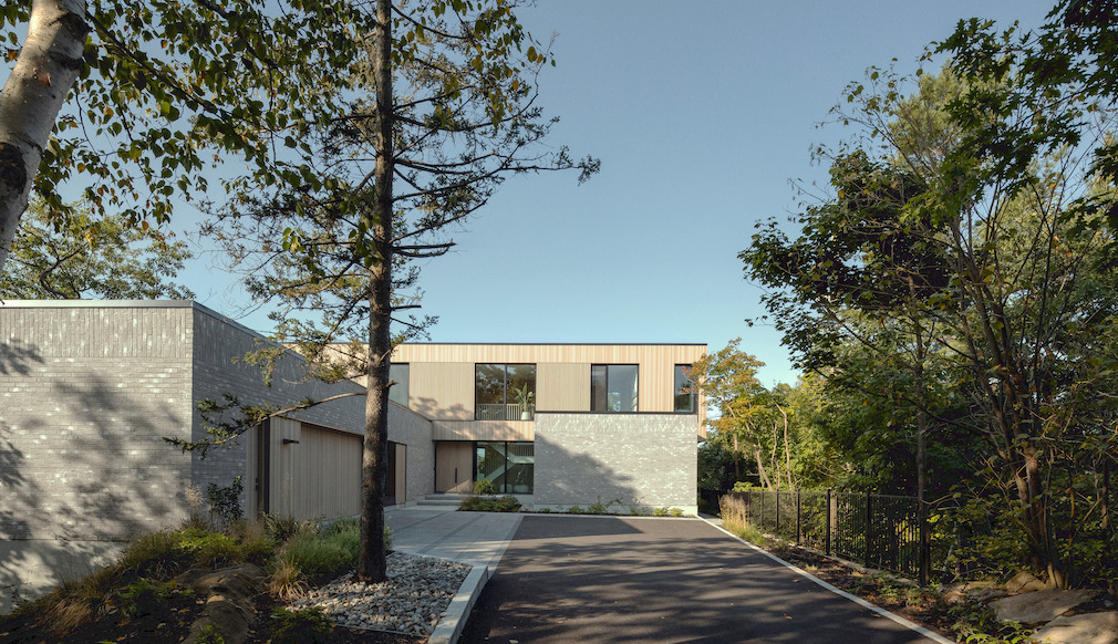 The building’s architecture blends masonry on the ground floor with wood on the upper floor. The light gray brick of the first level, with nuanced and textured tones, creates a mineral base for the house, reminiscent of the cliff. The large volume of wood on the second level, in contrast to the brick on the first floor, also offers a natural materiality, and its white cedar cladding adds lightness to the volume. The choice of materials allows the whole to harmoniously integrate with the wooded environment of the site.