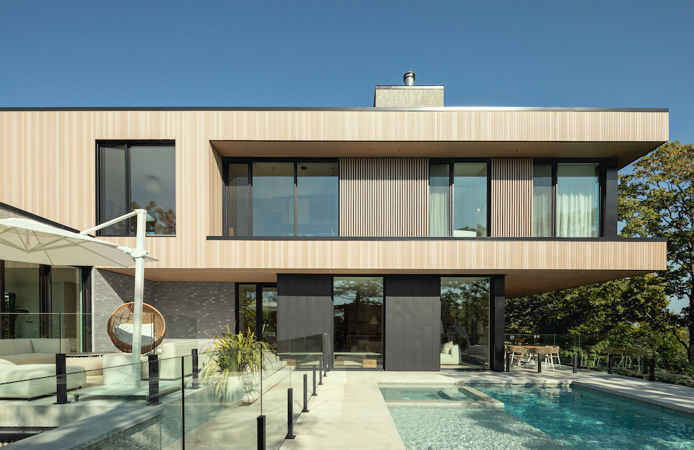 The interplay of volumes and openings that make up the architecture of this residence offers its occupants panoramic perspectives of the outdoor environment, while preserving their privacy. On the ground floor, two rectangular volumes are placed parallel to the St. Lawrence River, along the edge of the cliff. A third volume, placed perpendicularly above, forms the upper floor. This deliberate use of composition of volumes takes advantage of the site and its views, thus creating strong connections between the outdoors and in.