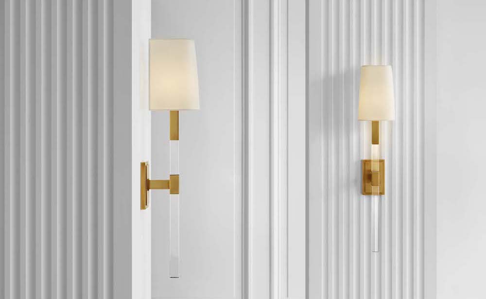 The Reagan Medium Tail Sconce by Chapman & Myers is an updated interpretation of a traditional crystal fixture with distinctive solid crystal arms seamlessly capped by a modernized rectangular metal candle cover and a faceted metal cuff.