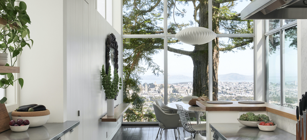As for color, the designer notes that, “I based the palette on the views seen from the windows, which include the Golden Gate and Bay Bridges, Alcatraz, Angel Island, and of course, San Francisco Bay. Each room is a different shade of greyblue with the living room being the lightest, showcasing the merest hint of color, and the back of the house the darkest, painted a deep grey-blue.”