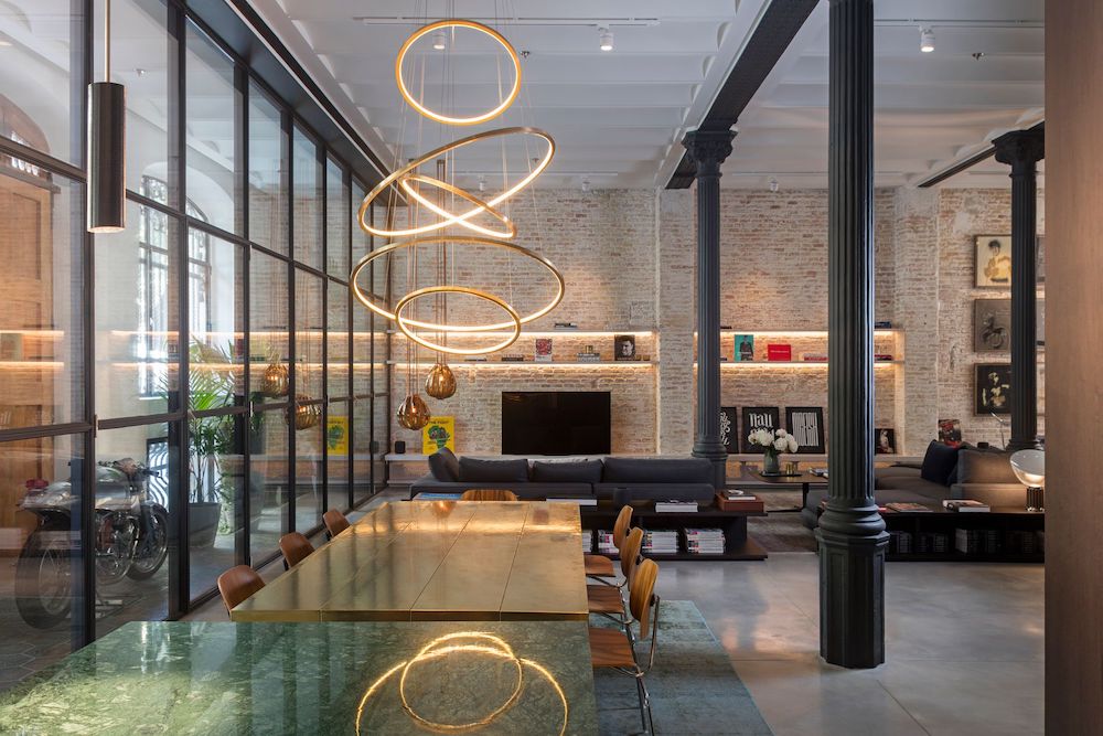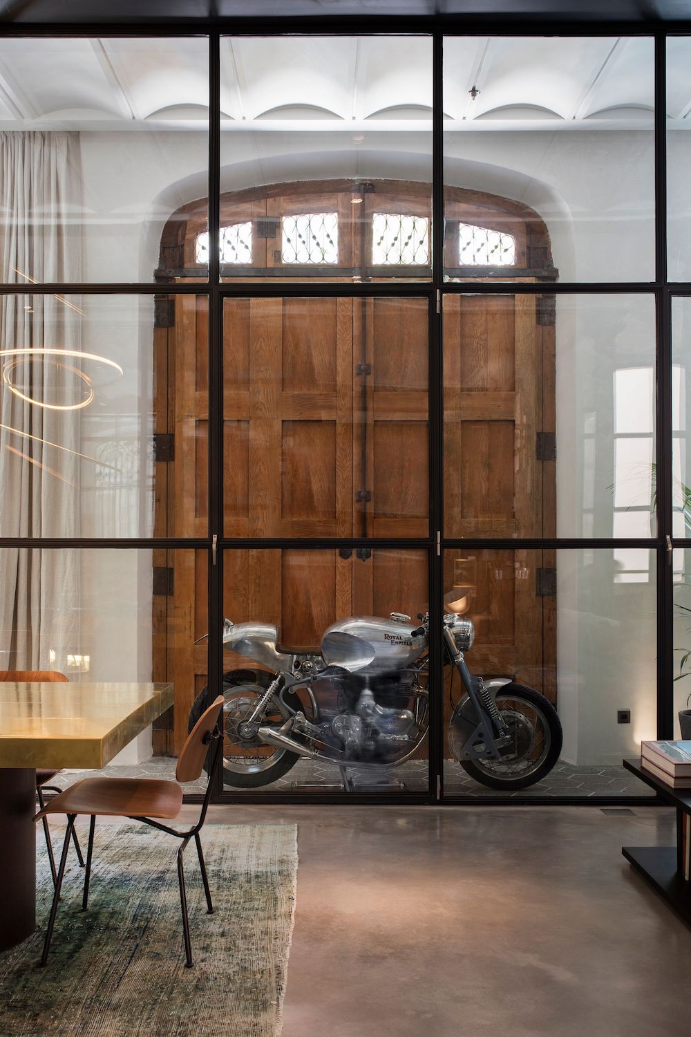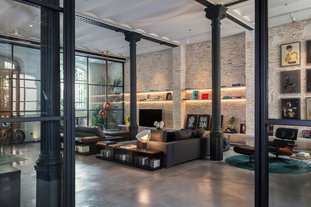 Formerly the warehouse and production site where horse carriages were stored, the 240m2 ground floor flat has now been transformed into a two-bedroom loft with a versatile, open layout that maintains the iconic elements of its past, as required by Barcelona’s Architecture Heritage Department, but also in line with Schwalgien’s own philosophy. The current design sees the original wooden door lovingly restored and all beams and pillars remain exposed, supporting the preserved ‘Volta Catalana’ (vaulted) ceiling. A sequence of industrial windows ensure insulation and allow natural light to pour through.