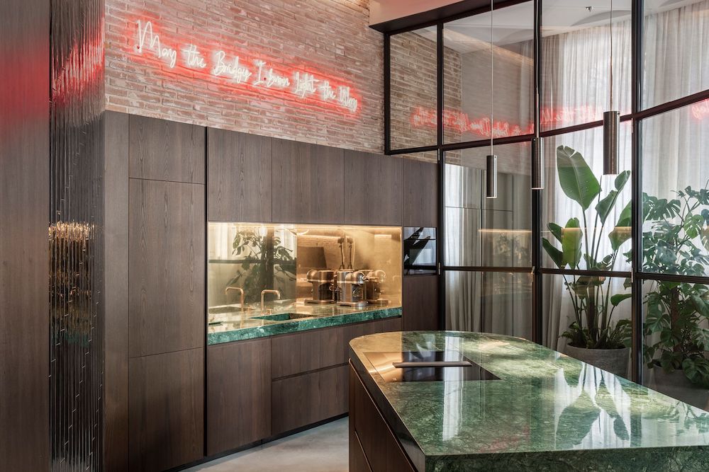 Her think-outside-of-the-box approach consistently maximizes space, privacy and aesthetics through clever design details, such as hidden sliding doors and a carefully concealed air-conditioned system. In the light-filled courtyard, an air shaft is completely covered by a vertical garden; and the master bedroom is separated from the living room by a box-like wooden structure that also houses a walk-in closet and a guest bathroom. Other bold, confident features of LoftBuresQ include the artworks, sourced and commissioned by Kristen Schwalgien Design, such as the neon sign above the kitchen wall, reading “May the bridges I burn light the way.”