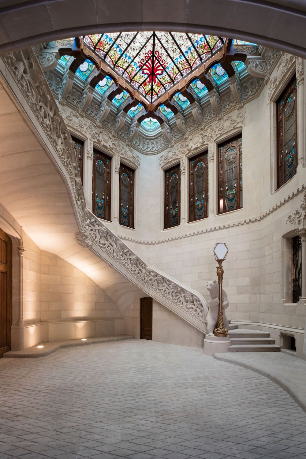 One of the best examples of Modernista architecture in Barcelona’s Eixample district, Casa Bures was originally commissioned back in 1905 by Catalan textile magnate Francesc Bures and built by Gaudi contemporary Francesc Berenguer. Its striking façade, ornate entrance, stained glass roof and carved stone sculpted staircase are all stand-out features of the protected building, which was bought by Bonavista Development Company and turned into 26 residential apartments in 2014. Kirsten Schwalgien Design was commissioned to convert the ground floor apartment into a sophisticated primary residence with a timeless, masculine feel.