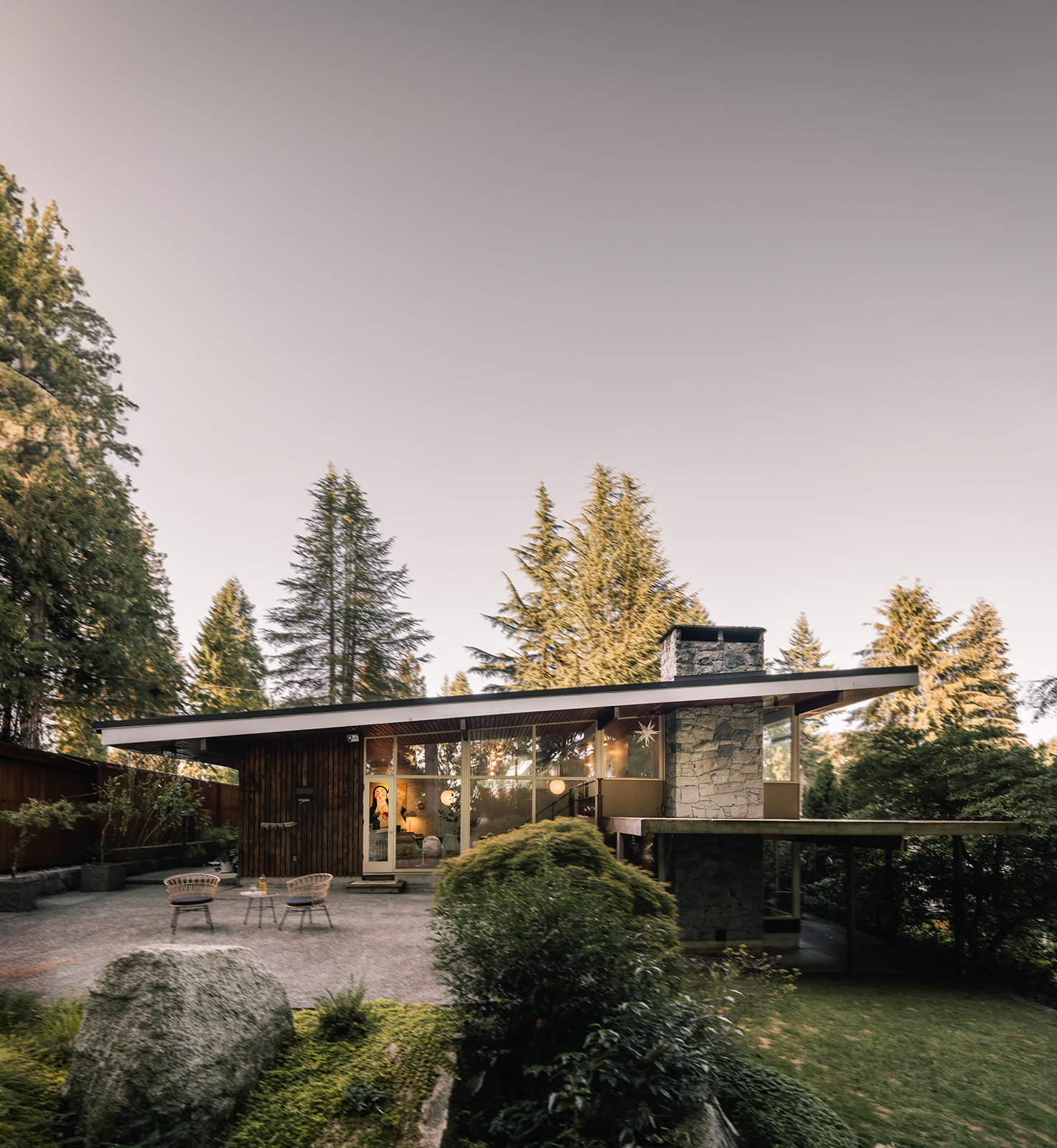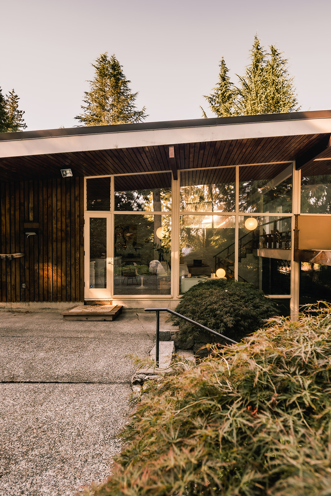 The home was designed by Gordon Hartley who modeled it after Richard Neutra’s never-built Case Study House #6, which features a sloping flat roof, an impressive entrance court and expansive wall windows. The Starlet House maintains these features and adapts them to a North Vancouver context, notably through the use of local cedar and granite.