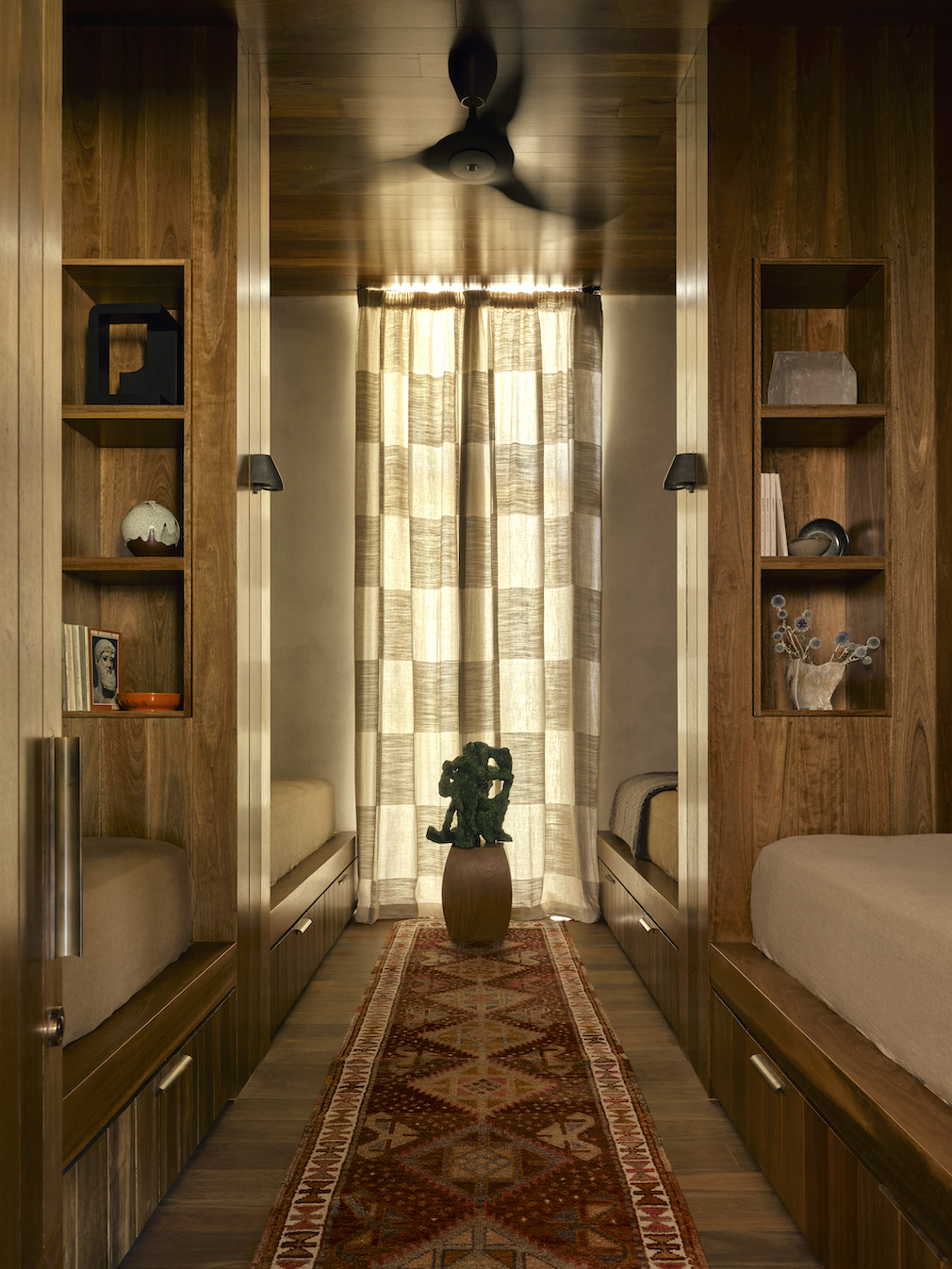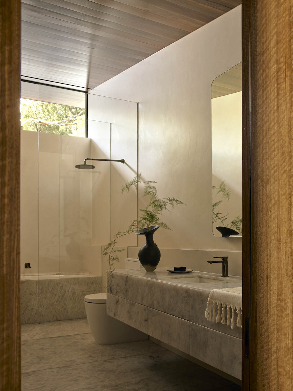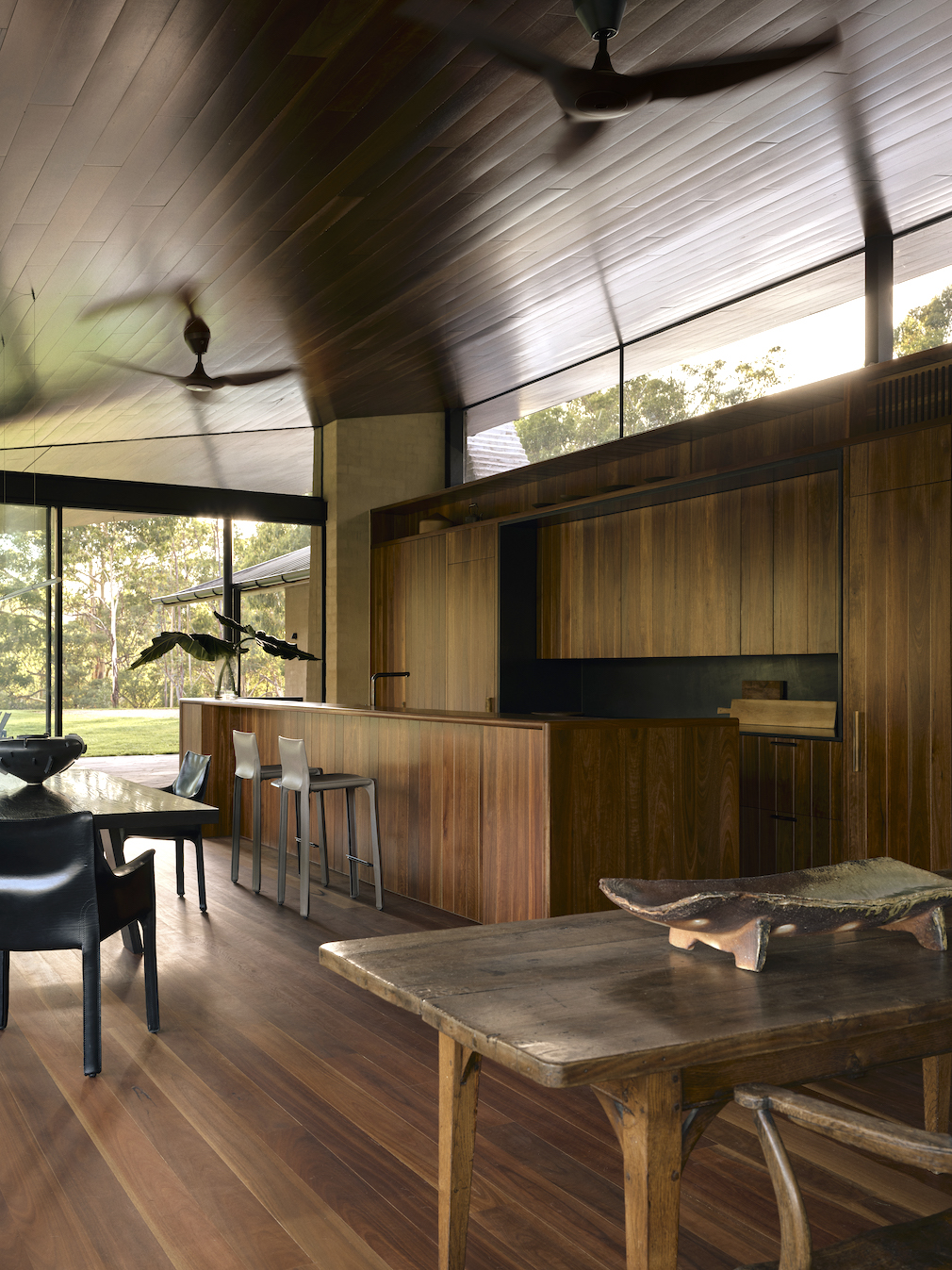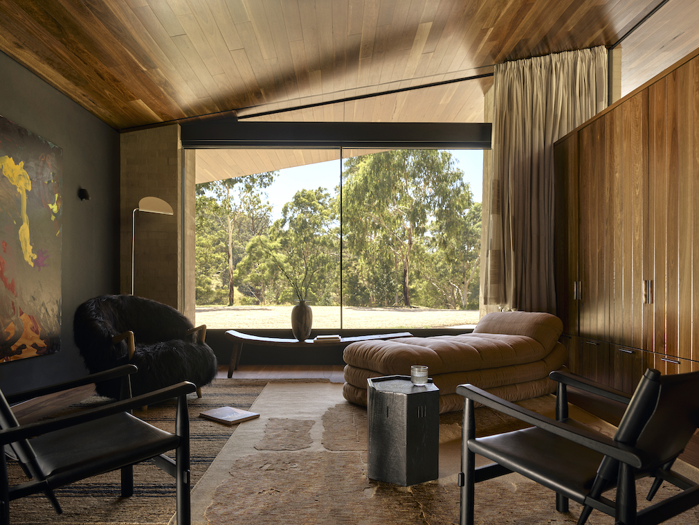 The interior design of the residence draws inspiration from the surrounding landscape, with a focus on durability, sustainability, layered warmth and well-being. The enveloping use of spotted gum timber is employed throughout the interior to create a seamless connection to the environment. “We distilled down to the minimum number of materials to design with, and the timber is an example of that,” Mills explains. “It’s both sustainable and resilient, while drawing from the vernacular traditions of rural architecture and embracing a refined, contemporary sensibility.”