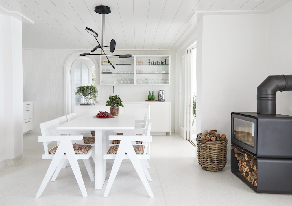 In turn, the challenge for interior designer Andrea Graff was to strike a balance between Old World elegance and creating a beach house that was comfortable, practical and relaxed. Taking her lead from the high-beamed ceilings and terrazzo floors, she chose a simple but dramatic all-white palette for the kitchen and casual dining space, which is open to the living area. A striking, custom-made Formica table and chairs with clean lines hold court in the dining space, while a subtle touch of whimsy comes in the form of a kitchen wall covered with handmade, curved tiles.