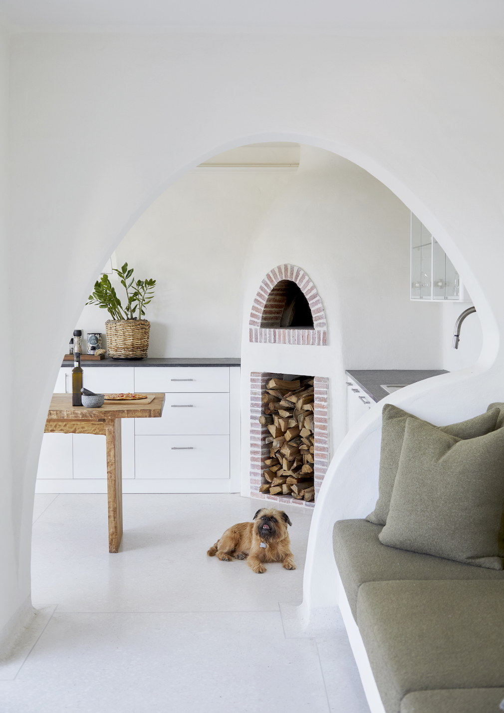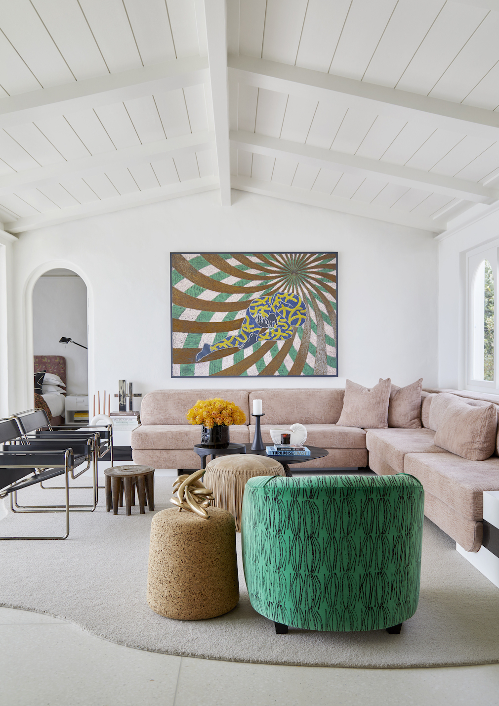 “I chose off-white to dominate the house, but I also wanted to use soft shades throughout to reference the sea and surrounding greens without relying on the blues typically used in beach houses,” explains Graff, whose studio custom-designed the furnishings to complement the original arched doorways and pay homage to the building’s heritage.