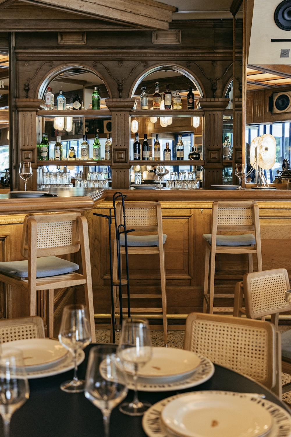 Complementary details maintain this same concept, expressed through timeless designs with a contemporary twist. The dining room wainscoting has brown leather applications, in dialogue with the original denim curtains and the new light blue denim upholstered seating, with lines that evoke the Nordic cabinetmaking tradition; on the terrace, the Thonet chairs and classic bistro tables are rejuvenated with aluminum edges and color accents and other French-influenced utilitarian elements— such as the copper pots, the Laguiole cutlery, or the tableware created in conjunction with Taller Ánfora—which communicate the informal essence of this space.