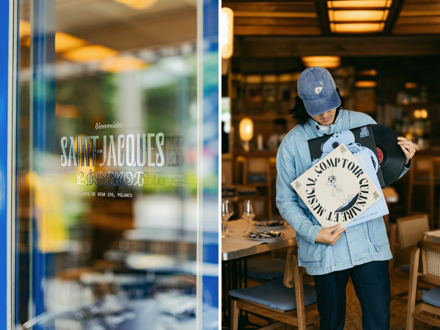 The comptoir is also a way to honor tradition while appealing to current tastes and sensibilities. Music, mixology and French cuisine are the pillars of Saint-Jacques Bistrot, and form an essential part of the iconography selected for its brand image: illustrations that are incorporated in a versatile way in the form of murals, decorative accents—on tableware, patches or uniforms—or as part of the various forms of graphic communication. The chromatic palette is inspired by the menu, made up of French dishes that combine the countryside and the sea. Different shades of brown coexist with two tones of blue (evoking stonewashed and original denim), complemented with black and an off-white hue, giving warmth and structure to a traditional but playful image.