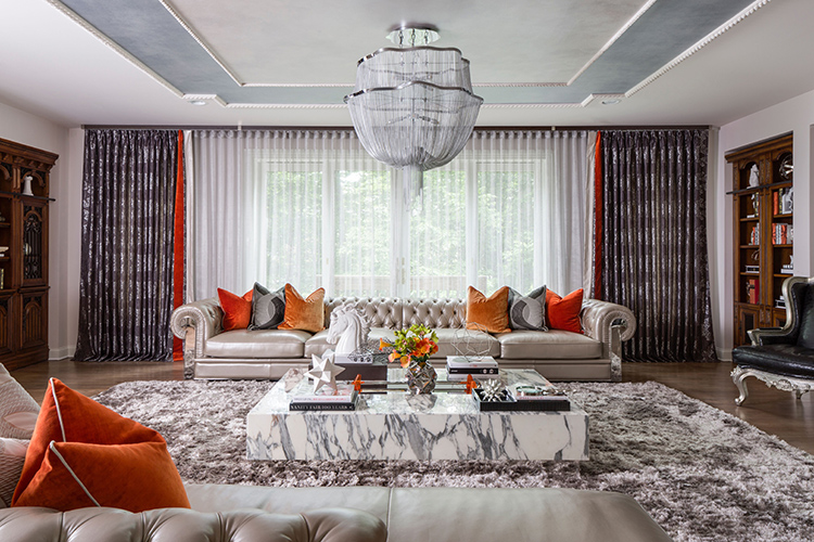 TALL ORDERS | In the clients’ expansive living room, Gerts chose a very long –18 foot–custom sofa in shimmery gray leather and black leather chairs with a silver wood finish that she later dressed up with dusty pewter for pizzazz. She is also passionate about window treatments. “They’re like jewelry,” she explains. “When everything is neutral, a touch of color in the window treatments adds personality.” For the 24-foot wall space, she handpicked silver mesh sheers and glam panels with orange and silver banding. “I love accessorizing,” declares Gerts.
