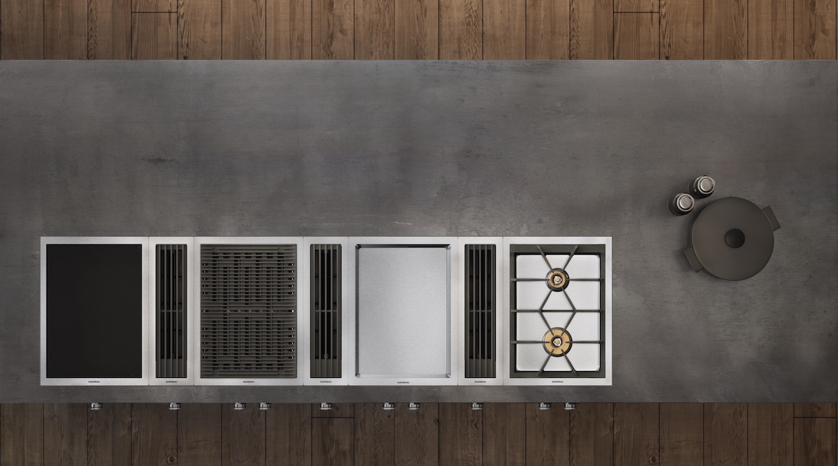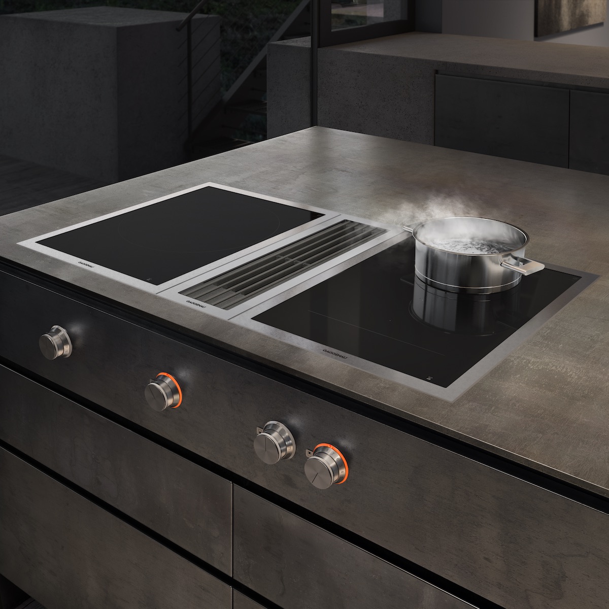 The Gaggenau downdraft ventilation elegantly sits alongside any of the Vario 400 series cooktops, including the framed or frameless flex induction options. Particularly useful next to pan-free cooking appliances such as Teppan Yaki and the electric grill, the downdraft also blends in seamlessly when interspersed between flex induction and gas cooktops.