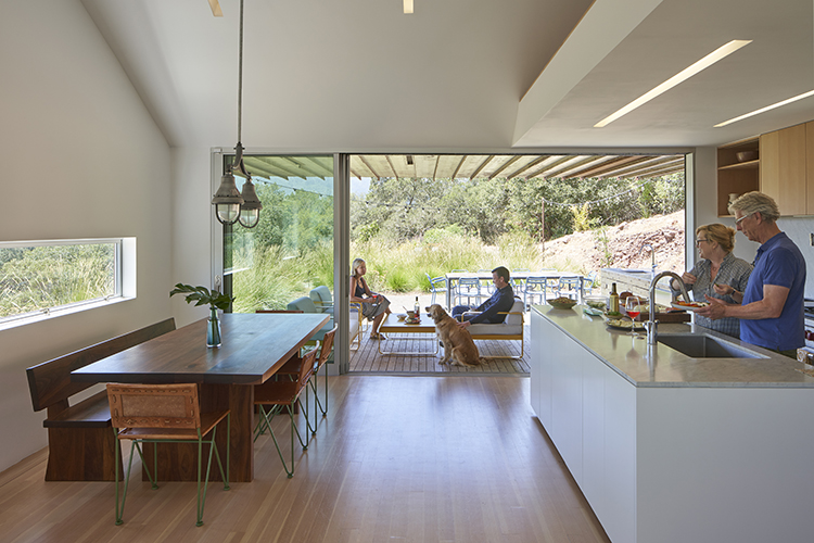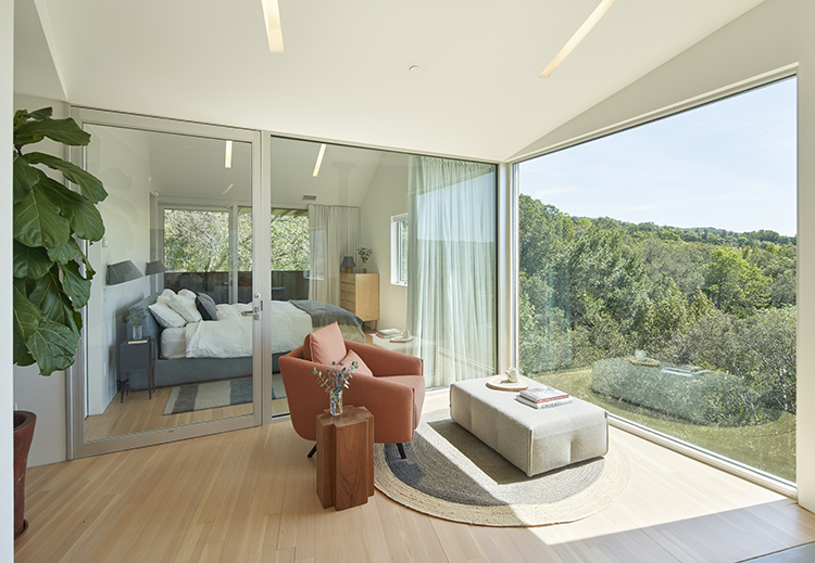 In many ways, the Triple Barn is influenced by the form and historic social functions of the farm, many of which dot the landscape in Sonoma. The thrice gabled building, clad in a modest rusted metal, define three zones associated with the farm: workshop, retreat, and forum. The workshop centers around the large and free-flowing indoor-outdoor kitchen with adjacent vegetable garden, used by homeowner and chef Hollie Greene Rottman on occasion to host healthful cooking seminars for parents and children. The retreat is the private living quarters of the couple, located in the east where the morning light enters and which is the most private part of the building. The forum is located in the heart of the building, where the workshop and retreat meet. It is a more intimate setting for friends and guests to gather in good company in front of a wood-burning stove while taking in an expansive view of Sonoma’s rolling hills, forests, and farms.