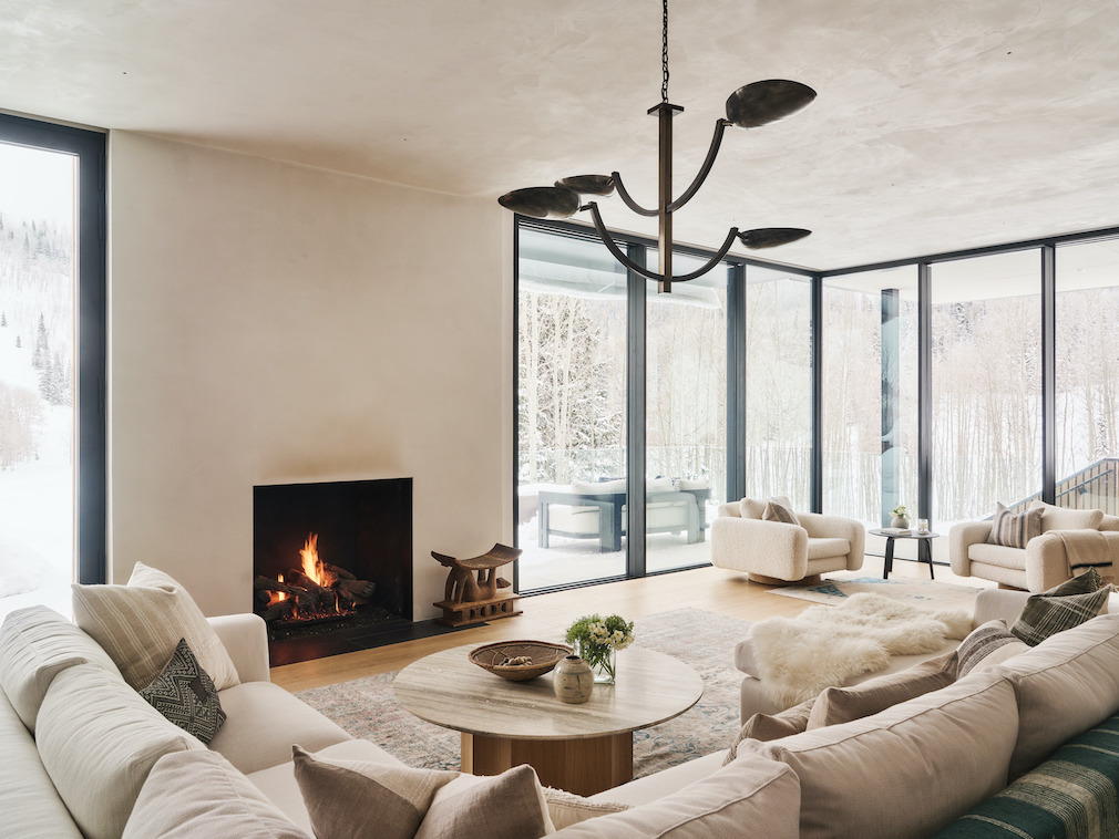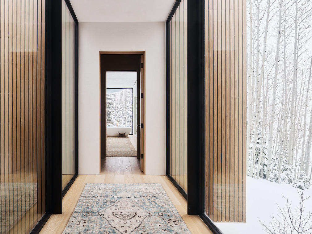 Designed for a California-based couple and their family, the home is nestled into a surrounding aspen grove amidst a sweeping meadow. Per the clients’ original vision, the concept for the home centered on “forest bathing” – the practice of taking in the sensory, rejuvenating aspects of a woodland setting. Rather than disrupting the forest, the design team sought to maintain existing vegetation on the sloped site, and stepped the home down organically with the hill: the architects worked thoughtfully to ensure that the home accommodated the site rather than imposing upon it. For instance, the landscape design includes sensitively integrated retaining walls along the slope that create pathways to lead the visitor gradually into the meadow.